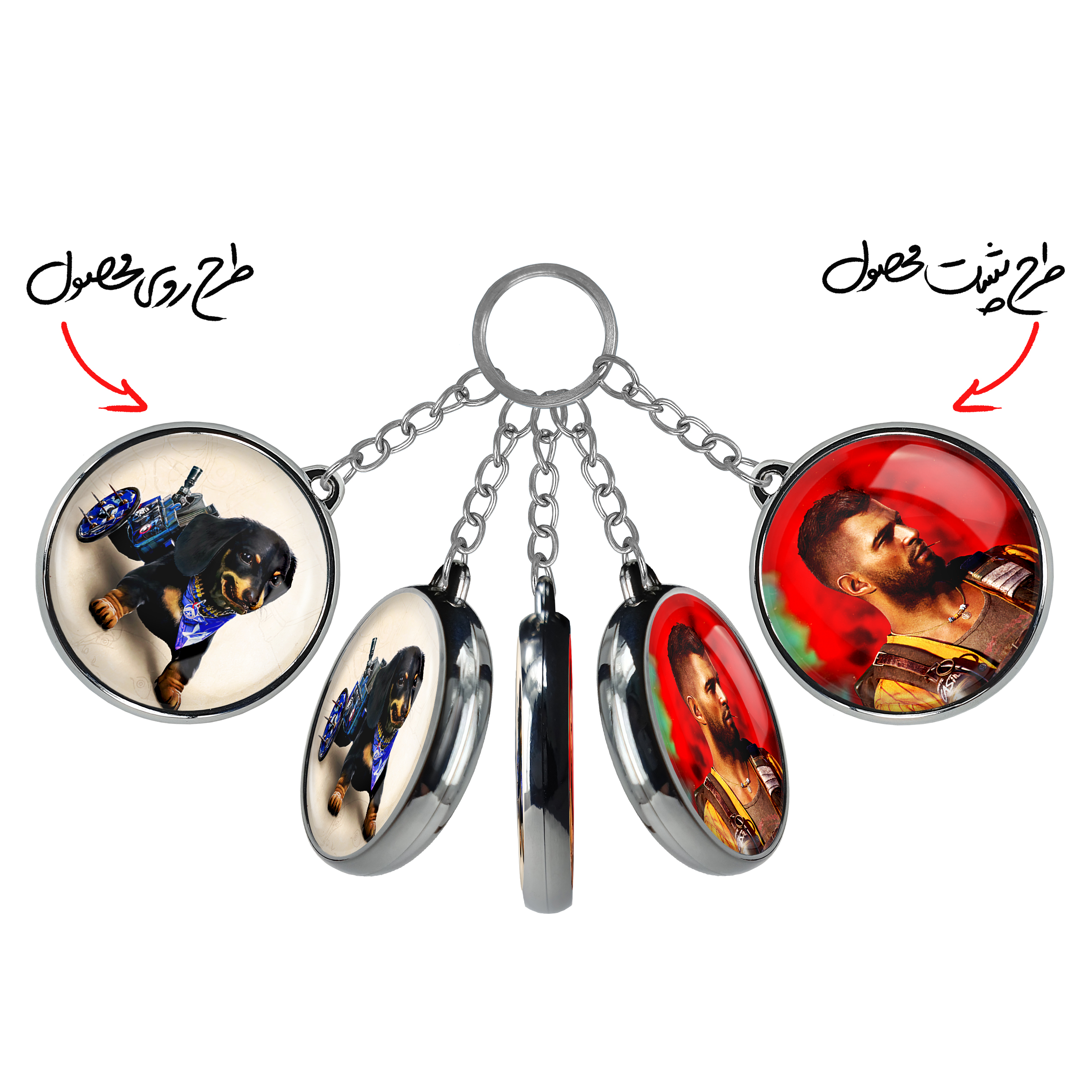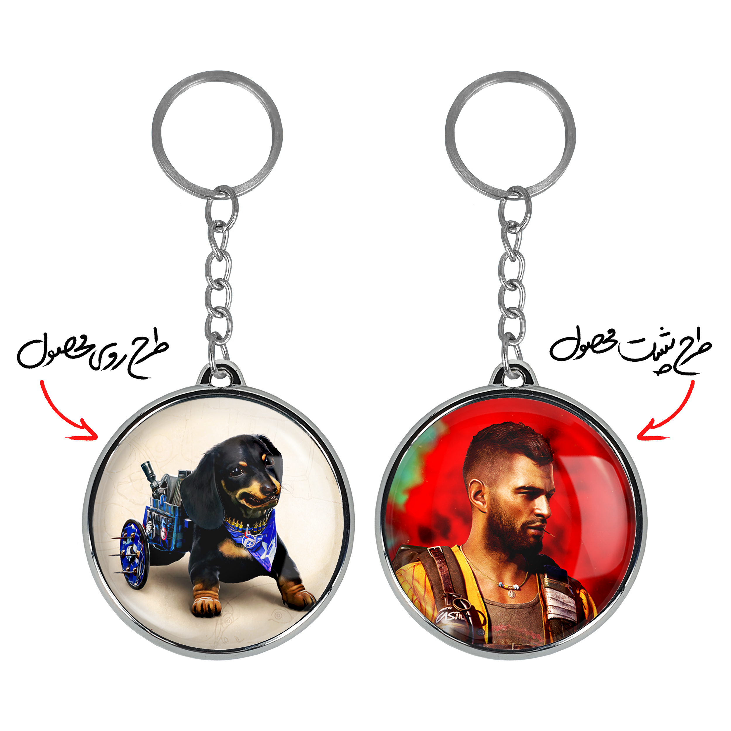 جاکلیدی دوطرفه سگ فار شیش فارکرایخندالو محصولی کاربردی و جدید است که در هر دو سمت محصول، تصویری متفاوت اما از یک موضوع چاپ شده و تفاوت اصلی آن با جاکلیدی های یک طرفه در همین است که هر دو سمت پشت و روی جاکلیدی، طرحی دیدنی و جذاب دارد. همچنین رینگ بکار برده شده برای دور طرح ها آبکاری کروم درجه یک و رنگ ثابت است و برخلاف سایر محصولات مشابه، از رنگ های متفرقه و یا سفید استفاده نشده، که این مهم، زیبایی محصول نهایی را چند برابر کرده است. جاکلیدی های دوطرفه سگ فار شیش فارکرایبا استفاده از روکش سلفون براق ضدخش تولید شده که خاصیت ضدخش بودن آن عمر مفید استفاده از جاکلیدی ها را افزایش میدهد. چاپ جاکلیدی ها با دستگاه های استاندارد و با بهترین سطح کیفیت صورت گرفته و طرح با شفافیتی مثال زدنی و با سلفون چسبی تولید شده است که باعث شده محصول نهایی بدون شکست نور دیده شود. همچنین بسته بندی جذاب و مینیمال جاکلیدی دوطرفه سگ فار شیش فارکرای، آنها را محصولی مناسب هدیه کرده است. زنجیر و حلقه بکار برده شده در جاکلیدی خندالو از نوع حلقه ضخیم و محکم بوده و حین استفاده آسیب نمی بیند.