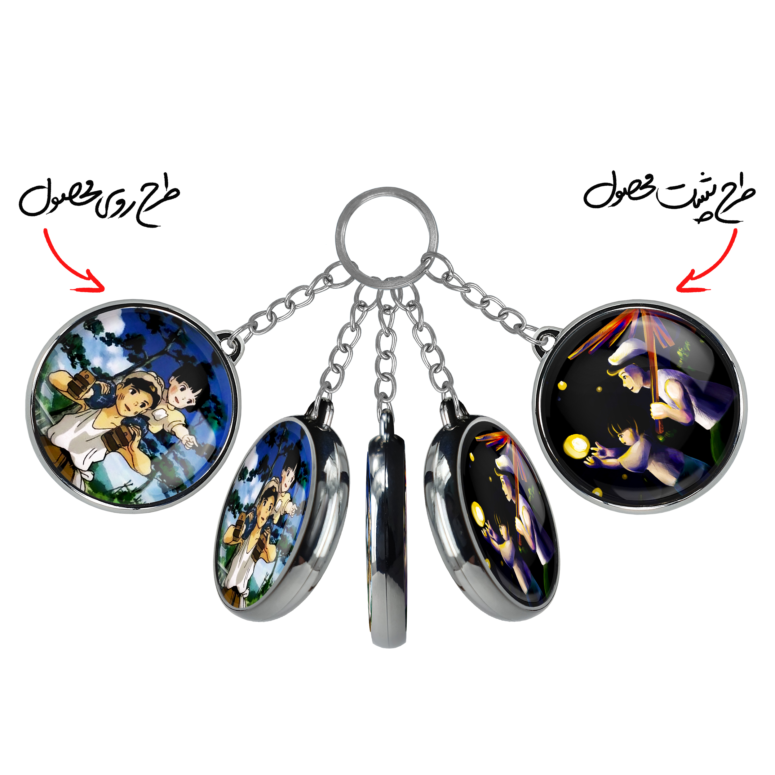 جاکلیدی دوطرفه سیتا و ستسوکو انیمیشن گورستان کرم های شب تاب خندالو محصولی کاربردی و جدید است که در هر دو سمت محصول، تصویری متفاوت اما از یک موضوع چاپ شده و تفاوت اصلی آن با جاکلیدی های یک طرفه در همین است که هر دو سمت پشت و روی جاکلیدی، طرحی دیدنی و جذاب دارد. همچنین رینگ بکار برده شده برای دور طرح ها آبکاری کروم درجه یک و رنگ ثابت است و برخلاف سایر محصولات مشابه، از رنگ های متفرقه و یا سفید استفاده نشده، که این مهم، زیبایی محصول نهایی را چند برابر کرده است. جاکلیدی های دوطرفه سیتا و ستسوکو انیمیشن گورستان کرم های شب تاب با استفاده از روکش سلفون براق ضدخش تولید شده که خاصیت ضدخش بودن آن عمر مفید استفاده از جاکلیدی ها را افزایش میدهد. چاپ جاکلیدی ها با دستگاه های استاندارد و با بهترین سطح کیفیت صورت گرفته و طرح با شفافیتی مثال زدنی و با سلفون چسبی تولید شده است که باعث شده محصول نهایی بدون شکست نور دیده شود. همچنین بسته بندی جذاب و مینیمال جاکلیدی دوطرفه سیتا و ستسوکو انیمیشن گورستان کرم های شب تاب ، آنها را محصولی مناسب هدیه کرده است. زنجیر و حلقه بکار برده شده در جاکلیدی خندالو از نوع حلقه ضخیم و محکم بوده و حین استفاده آسیب نمی بیند.