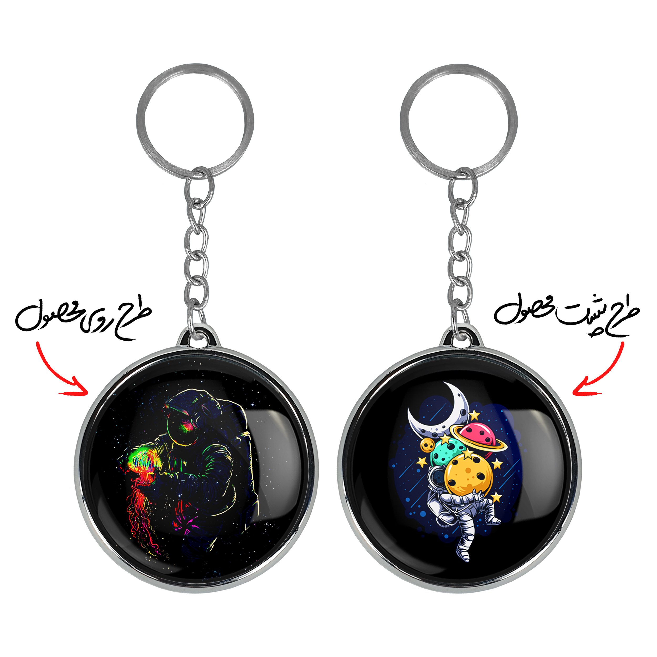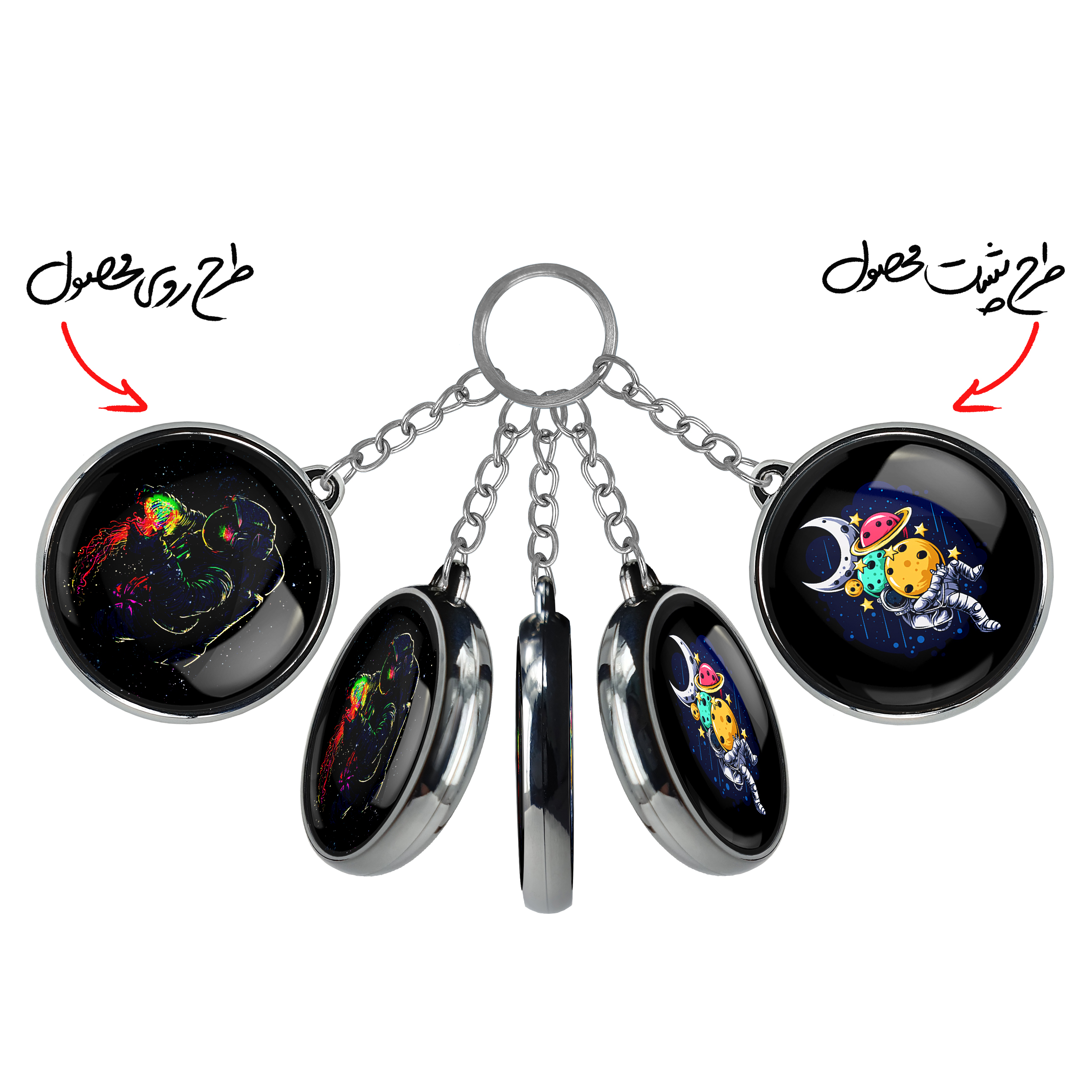 جاکلیدی دوطرفه فضاییخندالو محصولی کاربردی و جدید است که در هر دو سمت محصول، تصویری متفاوت اما از یک موضوع چاپ شده و تفاوت اصلی آن با جاکلیدی های یک طرفه در همین است که هر دو سمت پشت و روی جاکلیدی، طرحی دیدنی و جذاب دارد.