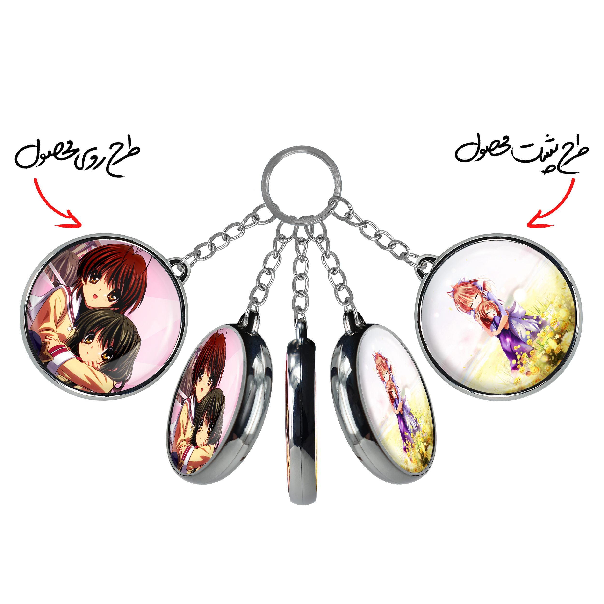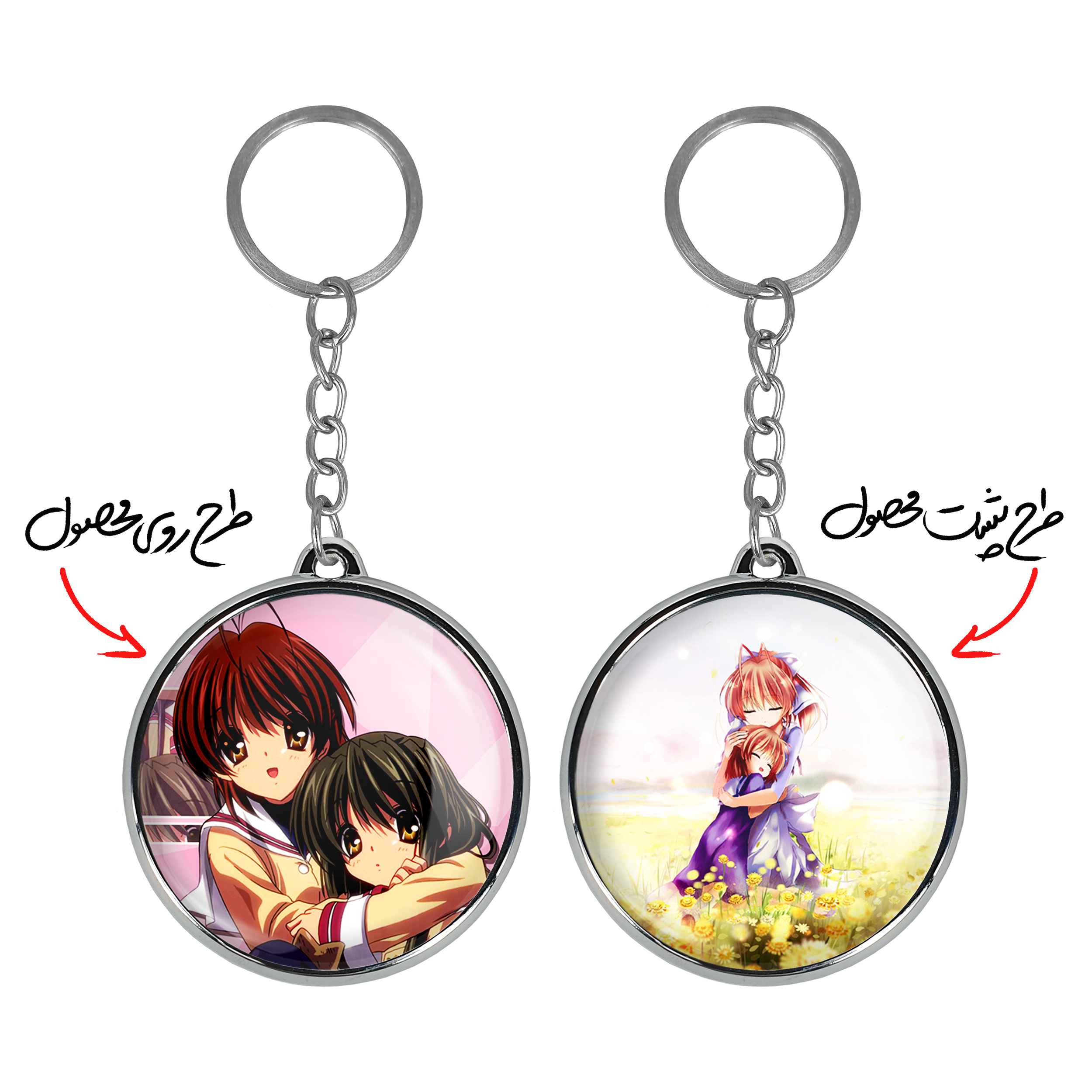 جاکلیدی دوطرفه فوکو ناگیسا انیمه کلاناد Clannad خندالو محصولی کاربردی و جدید است که در هر دو سمت محصول، تصویری متفاوت اما از یک موضوع چاپ شده و تفاوت اصلی آن با جاکلیدی های یک طرفه در همین است که هر دو سمت پشت و روی جاکلیدی، طرحی دیدنی و جذاب دارد. همچنین رینگ بکار برده شده برای دور طرح ها آبکاری کروم درجه یک و رنگ ثابت است و برخلاف سایر محصولات مشابه، از رنگ های متفرقه و یا سفید استفاده نشده، که این مهم، زیبایی محصول نهایی را چند برابر کرده است. جاکلیدی های دوطرفه فوکو ناگیسا انیمه کلاناد Clannad با استفاده از روکش سلفون براق ضدخش تولید شده که خاصیت ضدخش بودن آن عمر مفید استفاده از جاکلیدی ها را افزایش میدهد. چاپ جاکلیدی ها با دستگاه های استاندارد و با بهترین سطح کیفیت صورت گرفته و طرح با شفافیتی مثال زدنی و با سلفون چسبی تولید شده است که باعث شده محصول نهایی بدون شکست نور دیده شود. همچنین بسته بندی جذاب و مینیمال جاکلیدی دوطرفه فوکو ناگیسا انیمه کلاناد Clannad ، آنها را محصولی مناسب هدیه کرده است. زنجیر و حلقه بکار برده شده در جاکلیدی خندالو از نوع حلقه ضخیم و محکم بوده و حین استفاده آسیب نمی بیند.