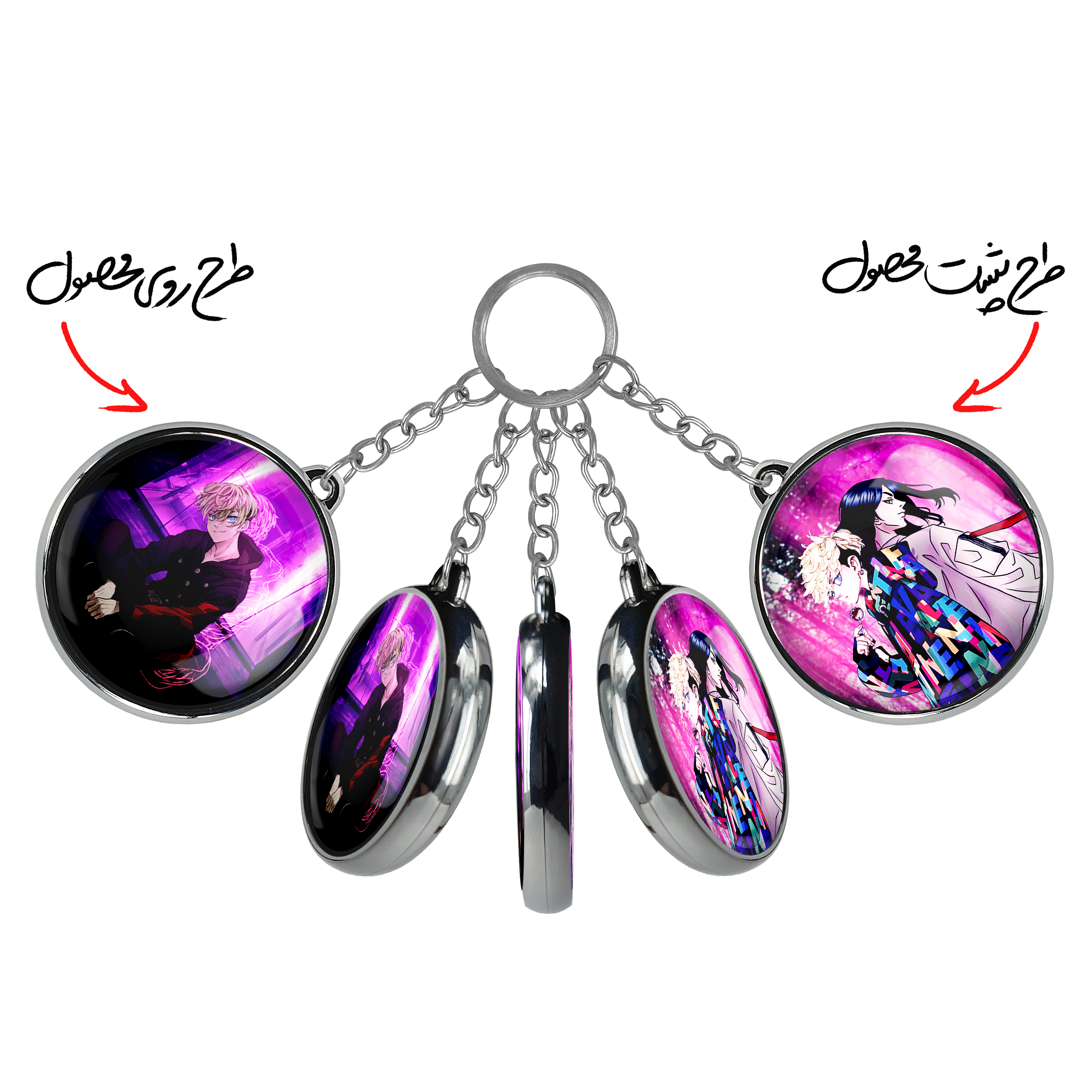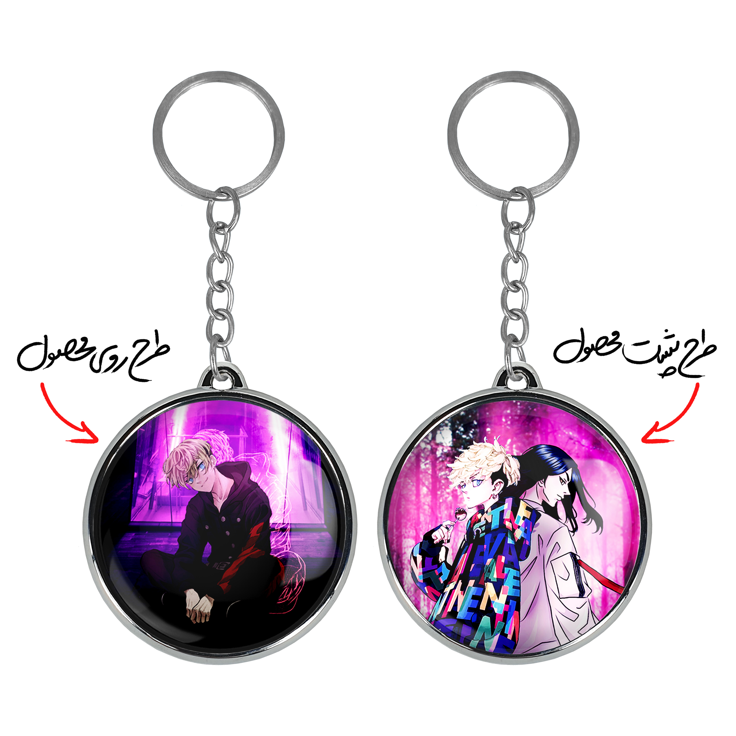 جاکلیدی دوطرفه ماتسونو چیفویو انیمه توکیو ریونجرز خندالو محصولی کاربردی و جدید است که در هر دو سمت محصول، تصویری متفاوت اما از یک موضوع چاپ شده و تفاوت اصلی آن با جاکلیدی های یک طرفه در همین است که هر دو سمت پشت و روی جاکلیدی، طرحی دیدنی و جذاب دارد. همچنین رینگ بکار برده شده برای دور طرح ها آبکاری کروم درجه یک و رنگ ثابت است و برخلاف سایر محصولات مشابه، از رنگ های متفرقه و یا سفید استفاده نشده، که این مهم، زیبایی محصول نهایی را چند برابر کرده است. جاکلیدی های دوطرفه ماتسونو چیفویو انیمه توکیو ریونجرز با استفاده از روکش سلفون براق ضدخش تولید شده که خاصیت ضدخش بودن آن عمر مفید استفاده از جاکلیدی ها را افزایش میدهد. چاپ جاکلیدی ها با دستگاه های استاندارد و با بهترین سطح کیفیت صورت گرفته و طرح با شفافیتی مثال زدنی و با سلفون چسبی تولید شده است که باعث شده محصول نهایی بدون شکست نور دیده شود. همچنین بسته بندی جذاب و مینیمال جاکلیدی دوطرفه ماتسونو چیفویو انیمه توکیو ریونجرز ، آنها را محصولی مناسب هدیه کرده است. زنجیر و حلقه بکار برده شده در جاکلیدی خندالو از نوع حلقه ضخیم و محکم بوده و حین استفاده آسیب نمی بیند.