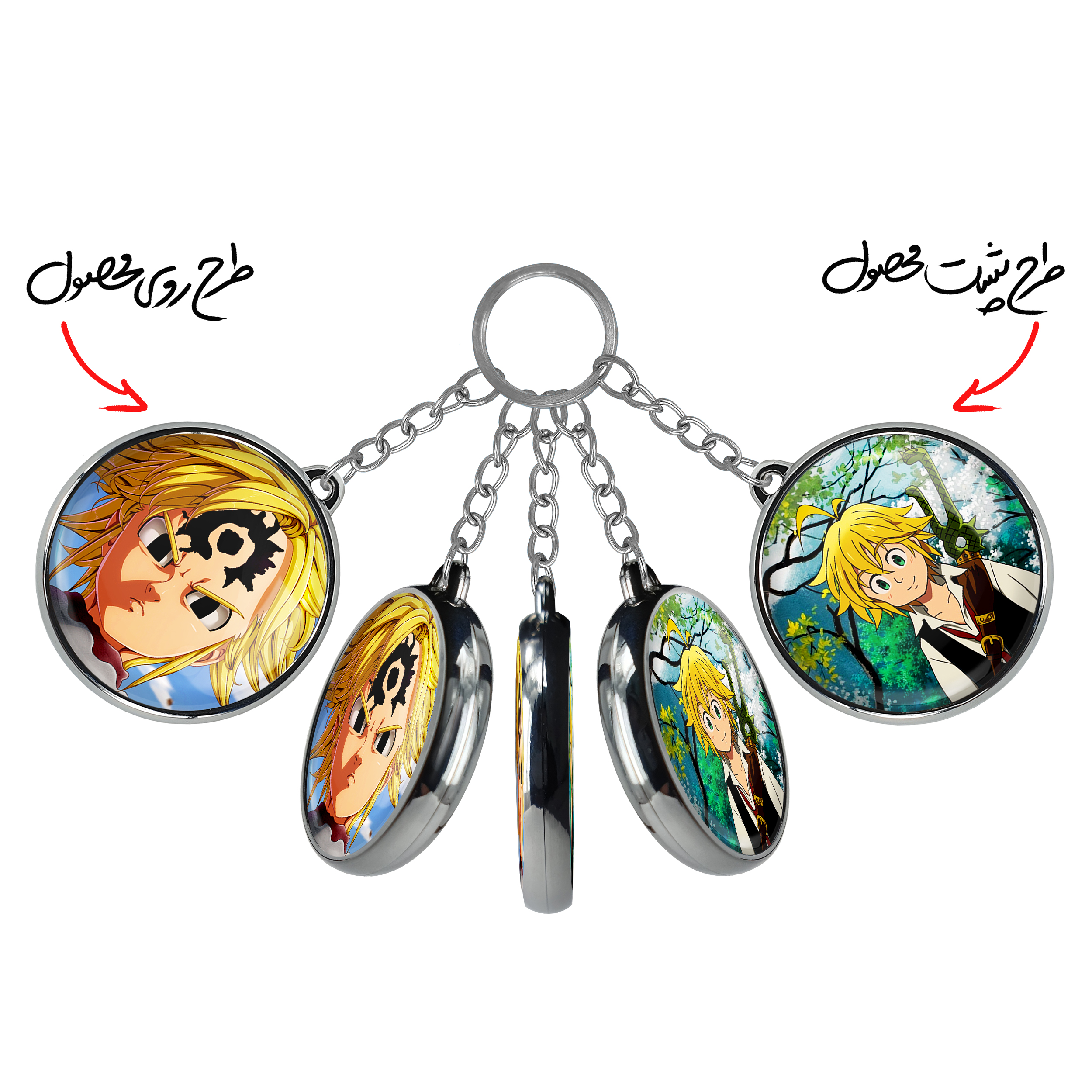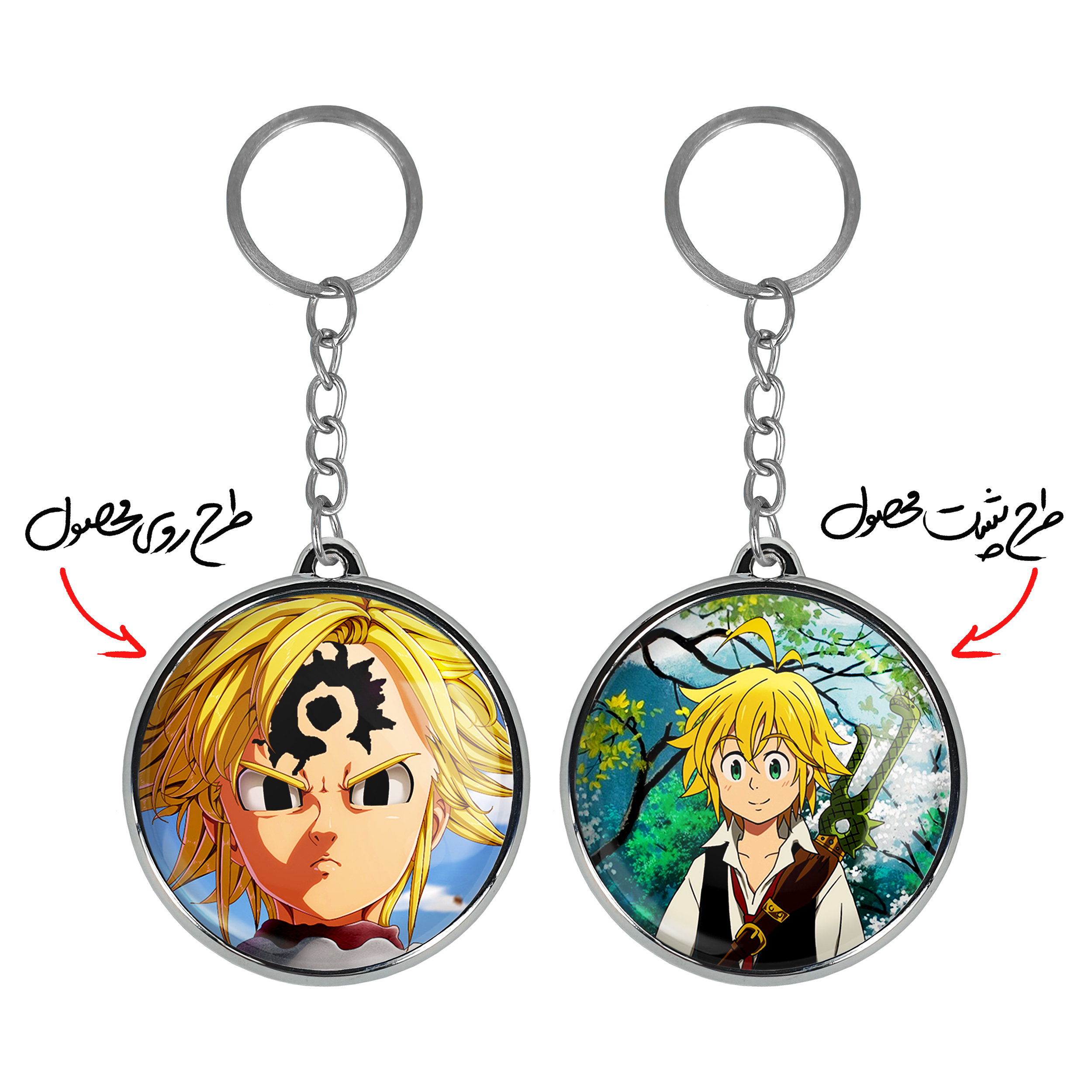 جاکلیدی دوطرفه ملیوداس انیمه هفت گناه کبیره خندالو محصولی کاربردی و جدید است که در هر دو سمت محصول، تصویری متفاوت اما از یک موضوع چاپ شده و تفاوت اصلی آن با جاکلیدی های یک طرفه در همین است که هر دو سمت پشت و روی جاکلیدی، طرحی دیدنی و جذاب دارد. همچنین رینگ بکار برده شده برای دور طرح ها آبکاری کروم درجه یک و رنگ ثابت است و برخلاف سایر محصولات مشابه، از رنگ های متفرقه و یا سفید استفاده نشده، که این مهم، زیبایی محصول نهایی را چند برابر کرده است. جاکلیدی های دوطرفه ملیوداس انیمه هفت گناه کبیره با استفاده از روکش سلفون براق ضدخش تولید شده که خاصیت ضدخش بودن آن عمر مفید استفاده از جاکلیدی ها را افزایش میدهد. چاپ جاکلیدی ها با دستگاه های استاندارد و با بهترین سطح کیفیت صورت گرفته و طرح با شفافیتی مثال زدنی و با سلفون چسبی تولید شده است که باعث شده محصول نهایی بدون شکست نور دیده شود. همچنین بسته بندی جذاب و مینیمال جاکلیدی دوطرفه ملیوداس انیمه هفت گناه کبیره ، آنها را محصولی مناسب هدیه کرده است. زنجیر و حلقه بکار برده شده در جاکلیدی خندالو از نوع حلقه ضخیم و محکم بوده و حین استفاده آسیب نمی بیند.