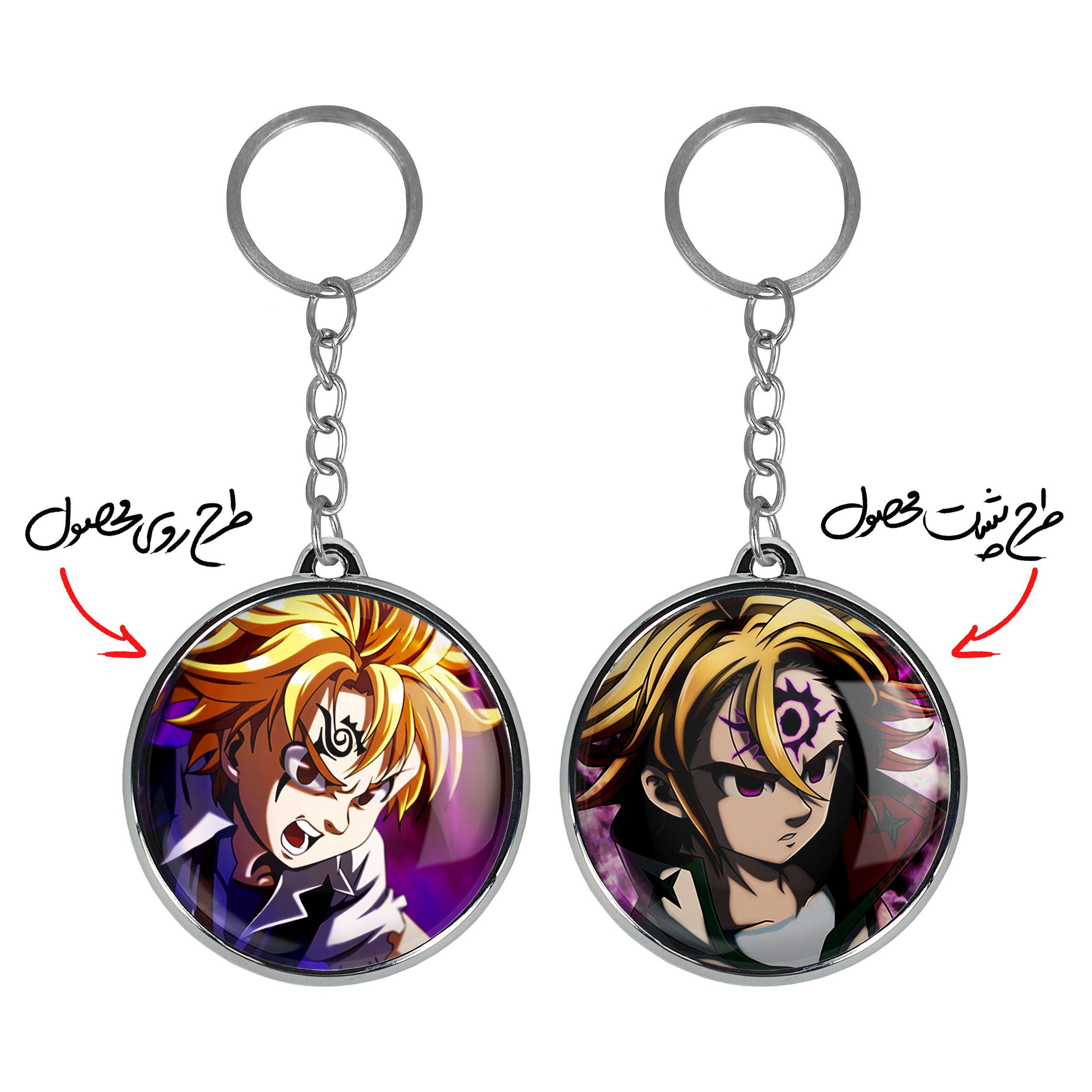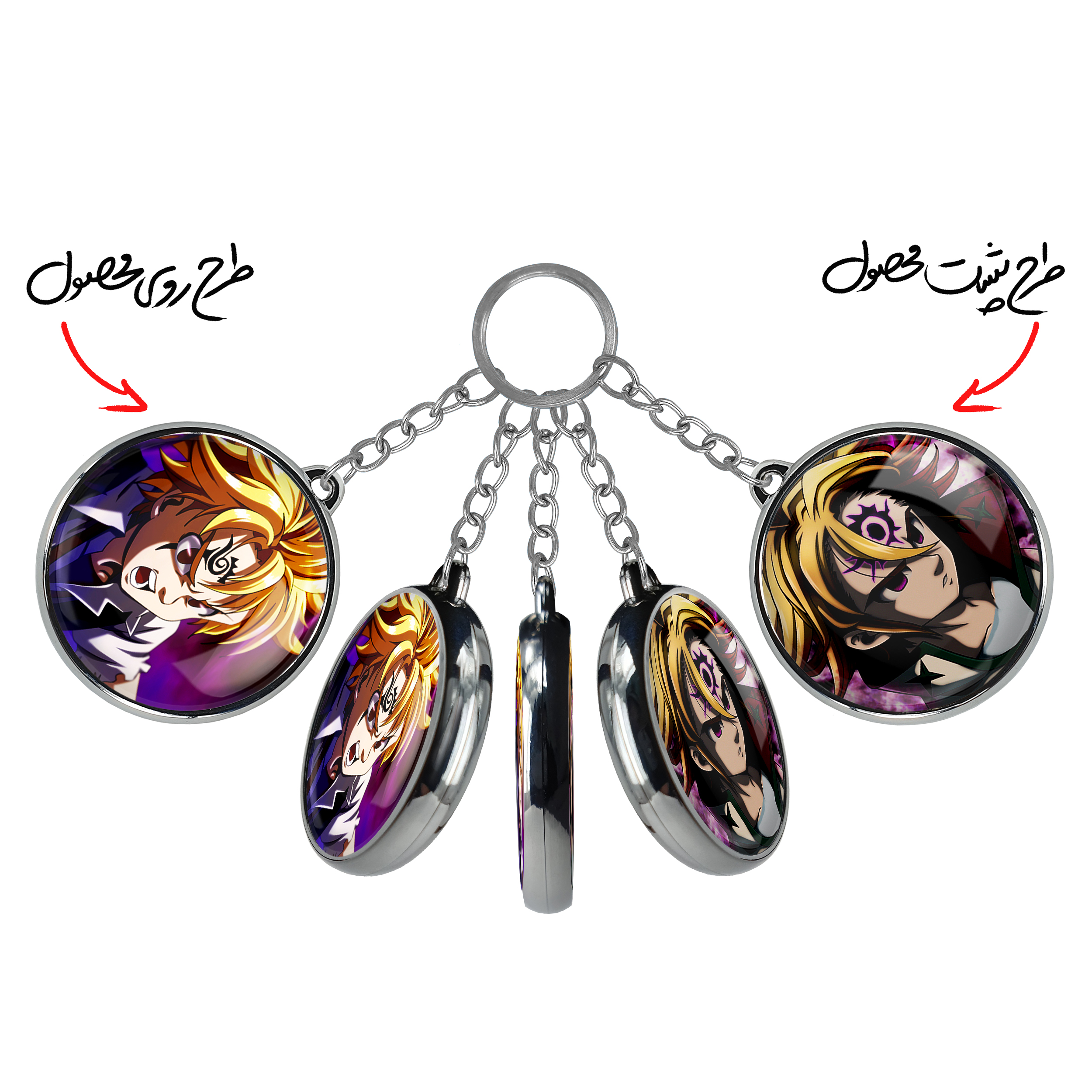 جاکلیدی دوطرفه ملیوداس انیمه هفت گناه کبیره خندالو محصولی کاربردی و جدید است که در هر دو سمت محصول، تصویری متفاوت اما از یک موضوع چاپ شده و تفاوت اصلی آن با جاکلیدی های یک طرفه در همین است که هر دو سمت پشت و روی جاکلیدی، طرحی دیدنی و جذاب دارد. همچنین رینگ بکار برده شده برای دور طرح ها آبکاری کروم درجه یک و رنگ ثابت است و برخلاف سایر محصولات مشابه، از رنگ های متفرقه و یا سفید استفاده نشده، که این مهم، زیبایی محصول نهایی را چند برابر کرده است. جاکلیدی های دوطرفه ملیوداس انیمه هفت گناه کبیره با استفاده از روکش سلفون براق ضدخش تولید شده که خاصیت ضدخش بودن آن عمر مفید استفاده از جاکلیدی ها را افزایش میدهد. چاپ جاکلیدی ها با دستگاه های استاندارد و با بهترین سطح کیفیت صورت گرفته و طرح با شفافیتی مثال زدنی و با سلفون چسبی تولید شده است که باعث شده محصول نهایی بدون شکست نور دیده شود. همچنین بسته بندی جذاب و مینیمال جاکلیدی دوطرفه ملیوداس انیمه هفت گناه کبیره ، آنها را محصولی مناسب هدیه کرده است. زنجیر و حلقه بکار برده شده در جاکلیدی خندالو از نوع حلقه ضخیم و محکم بوده و حین استفاده آسیب نمی بیند.