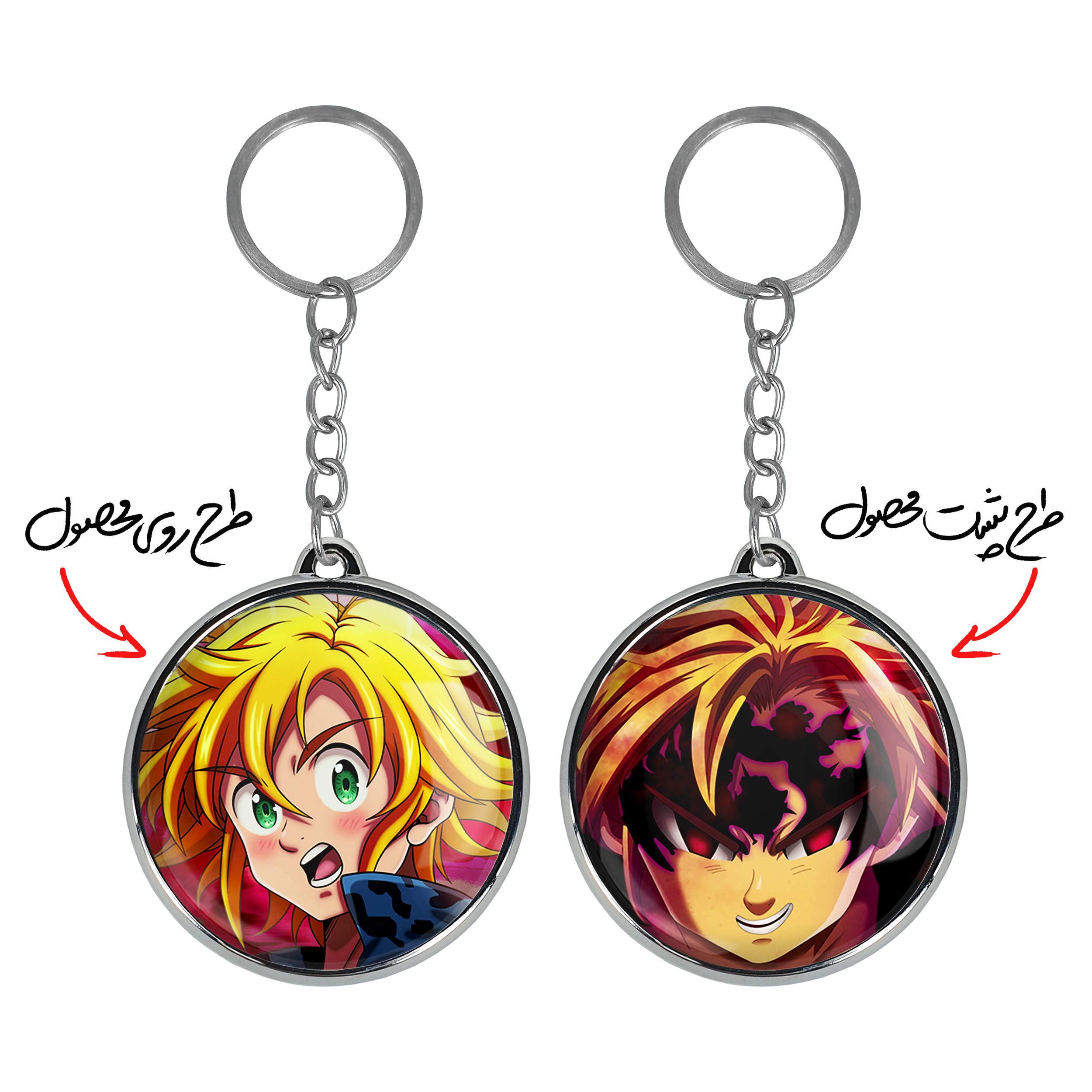 جاکلیدی دوطرفه ملیوداس انیمه هفت گناه کبیره خندالو محصولی کاربردی و جدید است که در هر دو سمت محصول، تصویری متفاوت اما از یک موضوع چاپ شده و تفاوت اصلی آن با جاکلیدی های یک طرفه در همین است که هر دو سمت پشت و روی جاکلیدی، طرحی دیدنی و جذاب دارد. همچنین رینگ بکار برده شده برای دور طرح ها آبکاری کروم درجه یک و رنگ ثابت است و برخلاف سایر محصولات مشابه، از رنگ های متفرقه و یا سفید استفاده نشده، که این مهم، زیبایی محصول نهایی را چند برابر کرده است. جاکلیدی های دوطرفه ملیوداس انیمه هفت گناه کبیره با استفاده از روکش سلفون براق ضدخش تولید شده که خاصیت ضدخش بودن آن عمر مفید استفاده از جاکلیدی ها را افزایش میدهد. چاپ جاکلیدی ها با دستگاه های استاندارد و با بهترین سطح کیفیت صورت گرفته و طرح با شفافیتی مثال زدنی و با سلفون چسبی تولید شده است که باعث شده محصول نهایی بدون شکست نور دیده شود. همچنین بسته بندی جذاب و مینیمال جاکلیدی دوطرفه ملیوداس انیمه هفت گناه کبیره ، آنها را محصولی مناسب هدیه کرده است. زنجیر و حلقه بکار برده شده در جاکلیدی خندالو از نوع حلقه ضخیم و محکم بوده و حین استفاده آسیب نمی بیند.