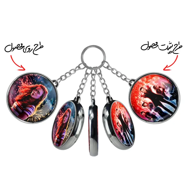 جاکلیدی دوطرفه مکس استرینجر تینگز Stranger Things خندالو محصولی کاربردی و جدید است که در هر دو سمت محصول، تصویری متفاوت اما از یک موضوع چاپ شده و تفاوت اصلی آن با جاکلیدی های یک طرفه در همین است که هر دو سمت پشت و روی جاکلیدی، طرحی دیدنی و جذاب دارد. همچنین رینگ بکار برده شده برای دور طرح ها آبکاری کروم درجه یک و رنگ ثابت است و برخلاف سایر محصولات مشابه، از رنگ های متفرقه و یا سفید استفاده نشده، که این مهم، زیبایی محصول نهایی را چند برابر کرده است. جاکلیدی های دوطرفه مکس استرینجر تینگز Stranger Things با استفاده از روکش سلفون براق ضدخش تولید شده که خاصیت ضدخش بودن آن عمر مفید استفاده از جاکلیدی ها را افزایش میدهد. چاپ جاکلیدی ها با دستگاه های استاندارد و با بهترین سطح کیفیت صورت گرفته و طرح با شفافیتی مثال زدنی و با سلفون چسبی تولید شده است که باعث شده محصول نهایی بدون شکست نور دیده شود. همچنین بسته بندی جذاب و مینیمال جاکلیدی دوطرفه مکس استرینجر تینگز Stranger Things ، آنها را محصولی مناسب هدیه کرده است. زنجیر و حلقه بکار برده شده در جاکلیدی خندالو از نوع حلقه ضخیم و محکم بوده و حین استفاده آسیب نمی بیند.