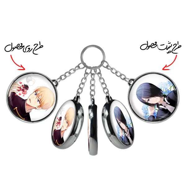 جاکلیدی دوطرفه میوکی ساما انیمه کاگویا ساما خندالو محصولی کاربردی و جدید است که در هر دو سمت محصول، تصویری متفاوت اما از یک موضوع چاپ شده و تفاوت اصلی آن با جاکلیدی های یک طرفه در همین است که هر دو سمت پشت و روی جاکلیدی، طرحی دیدنی و جذاب دارد. همچنین رینگ بکار برده شده برای دور طرح ها آبکاری کروم درجه یک و رنگ ثابت است و برخلاف سایر محصولات مشابه، از رنگ های متفرقه و یا سفید استفاده نشده، که این مهم، زیبایی محصول نهایی را چند برابر کرده است. جاکلیدی های دوطرفه میوکی ساما انیمه کاگویا ساما با استفاده از روکش سلفون براق ضدخش تولید شده که خاصیت ضدخش بودن آن عمر مفید استفاده از جاکلیدی ها را افزایش میدهد. چاپ جاکلیدی ها با دستگاه های استاندارد و با بهترین سطح کیفیت صورت گرفته و طرح با شفافیتی مثال زدنی و با سلفون چسبی تولید شده است که باعث شده محصول نهایی بدون شکست نور دیده شود. همچنین بسته بندی جذاب و مینیمال جاکلیدی دوطرفه میوکی ساما انیمه کاگویا ساما ، آنها را محصولی مناسب هدیه کرده است. زنجیر و حلقه بکار برده شده در جاکلیدی خندالو از نوع حلقه ضخیم و محکم بوده و حین استفاده آسیب نمی بیند.