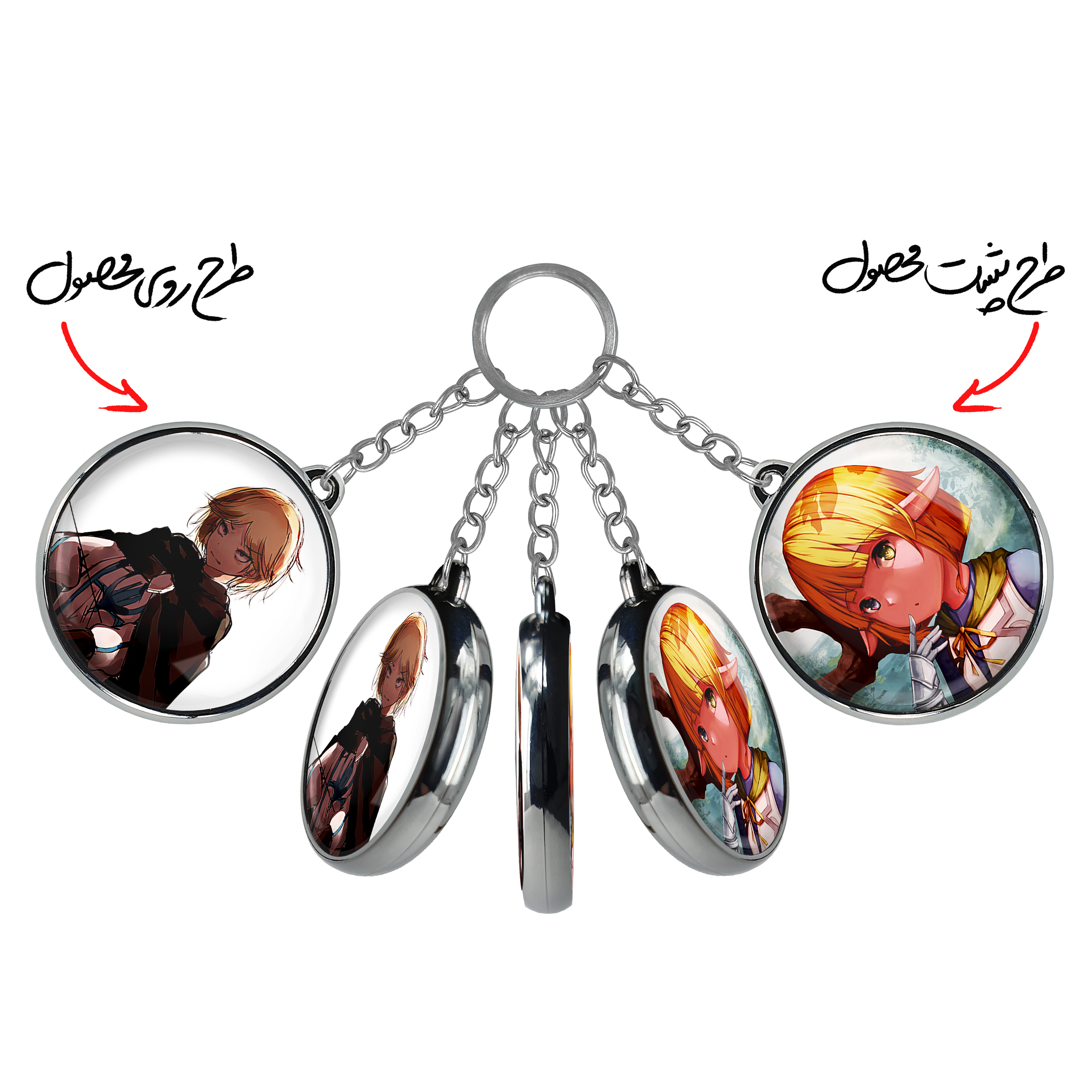 جاکلیدی دوطرفه نیا انیمه اورلرد Overlord خندالو محصولی کاربردی و جدید است که در هر دو سمت محصول، تصویری متفاوت اما از یک موضوع چاپ شده و تفاوت اصلی آن با جاکلیدی های یک طرفه در همین است که هر دو سمت پشت و روی جاکلیدی، طرحی دیدنی و جذاب دارد. همچنین رینگ بکار برده شده برای دور طرح ها آبکاری کروم درجه یک و رنگ ثابت است و برخلاف سایر محصولات مشابه، از رنگ های متفرقه و یا سفید استفاده نشده، که این مهم، زیبایی محصول نهایی را چند برابر کرده است. جاکلیدی های دوطرفه نیا انیمه اورلرد Overlord با استفاده از روکش سلفون براق ضدخش تولید شده که خاصیت ضدخش بودن آن عمر مفید استفاده از جاکلیدی ها را افزایش میدهد. چاپ جاکلیدی ها با دستگاه های استاندارد و با بهترین سطح کیفیت صورت گرفته و طرح با شفافیتی مثال زدنی و با سلفون چسبی تولید شده است که باعث شده محصول نهایی بدون شکست نور دیده شود. همچنین بسته بندی جذاب و مینیمال جاکلیدی دوطرفه نیا انیمه اورلرد Overlord ، آنها را محصولی مناسب هدیه کرده است. زنجیر و حلقه بکار برده شده در جاکلیدی خندالو از نوع حلقه ضخیم و محکم بوده و حین استفاده آسیب نمی بیند.