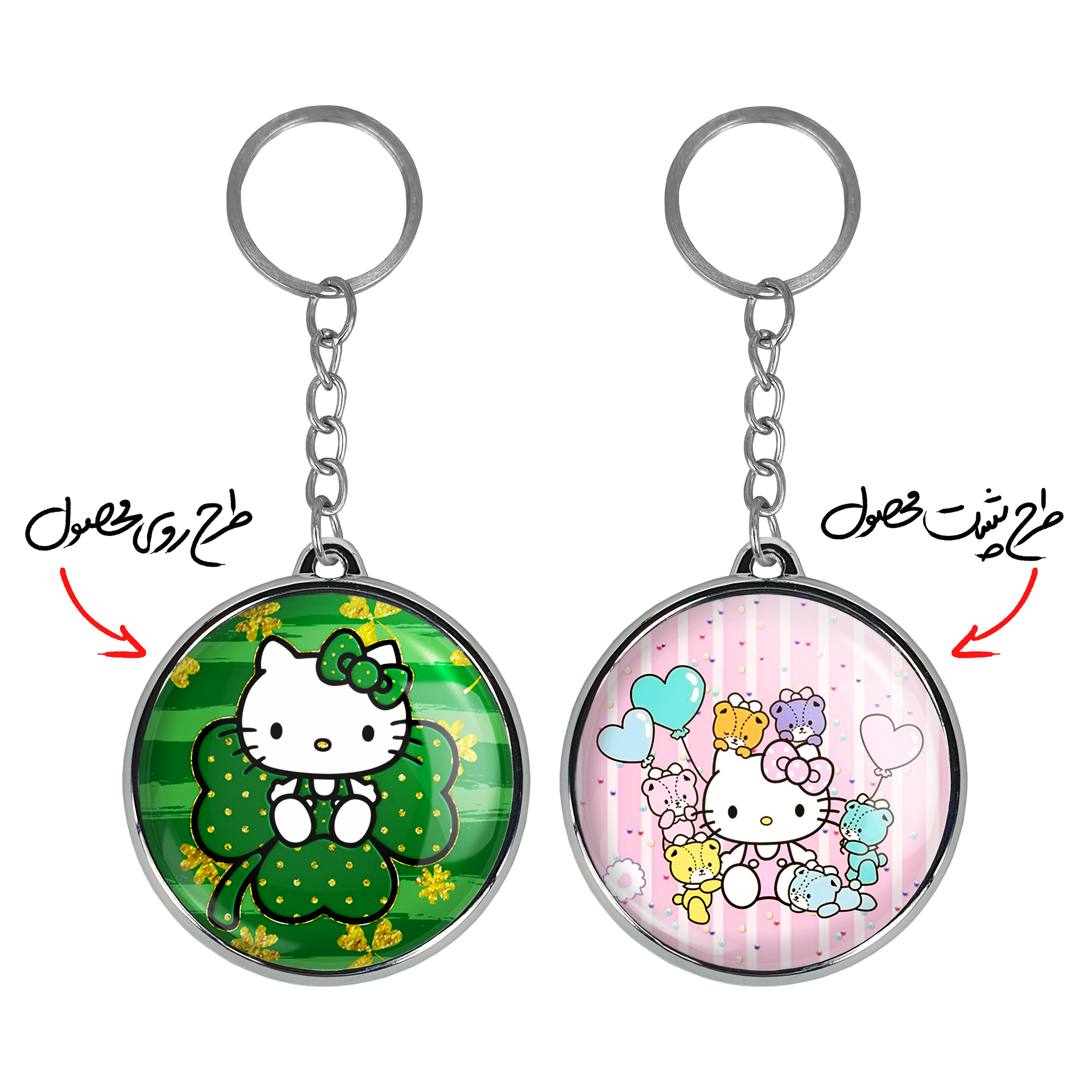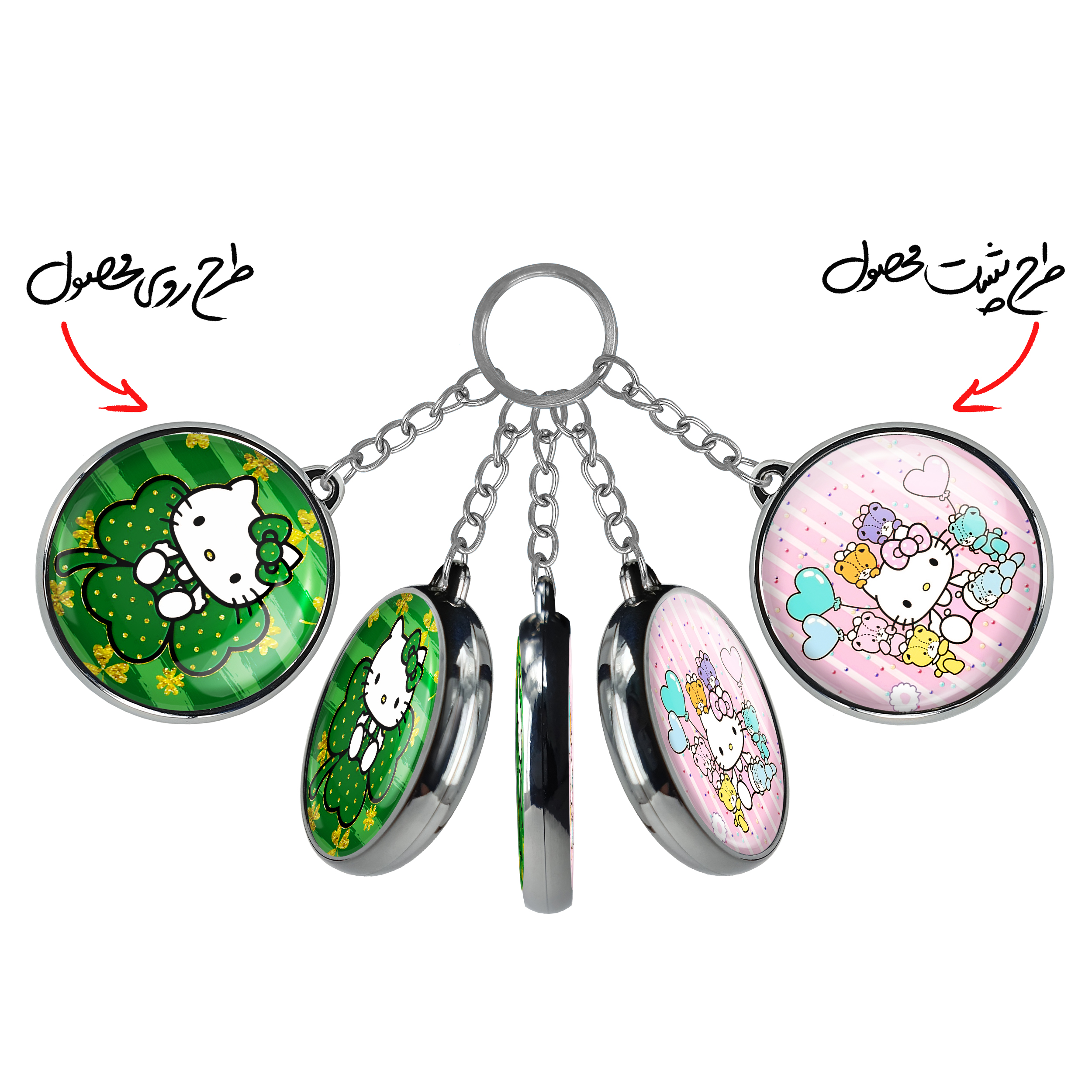 جاکلیدی دوطرفه هلو کیتیخندالو محصولی کاربردی و جدید است که در هر دو سمت محصول، تصویری متفاوت اما از یک موضوع چاپ شده و تفاوت اصلی آن با جاکلیدی های یک طرفه در همین است که هر دو سمت پشت و روی جاکلیدی، طرحی دیدنی و جذاب دارد.