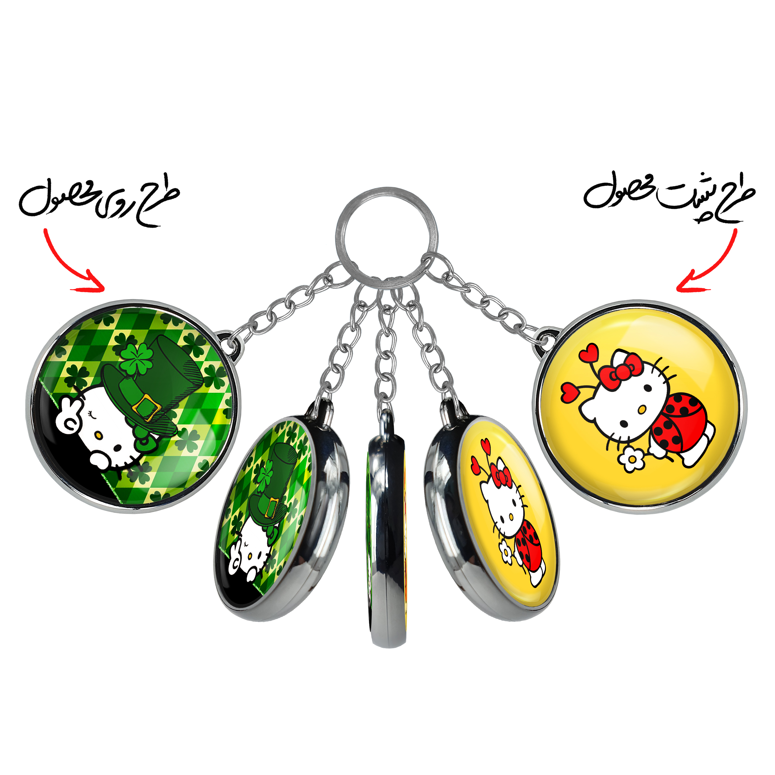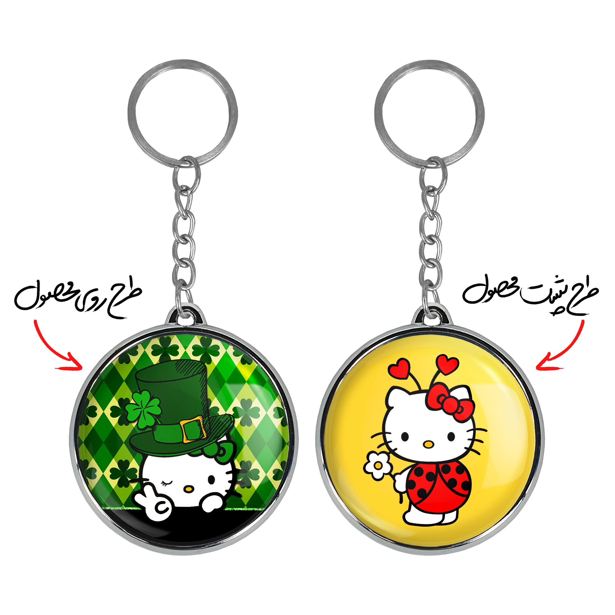 جاکلیدی دوطرفه هلو کیتیخندالو محصولی کاربردی و جدید است که در هر دو سمت محصول، تصویری متفاوت اما از یک موضوع چاپ شده و تفاوت اصلی آن با جاکلیدی های یک طرفه در همین است که هر دو سمت پشت و روی جاکلیدی، طرحی دیدنی و جذاب دارد.