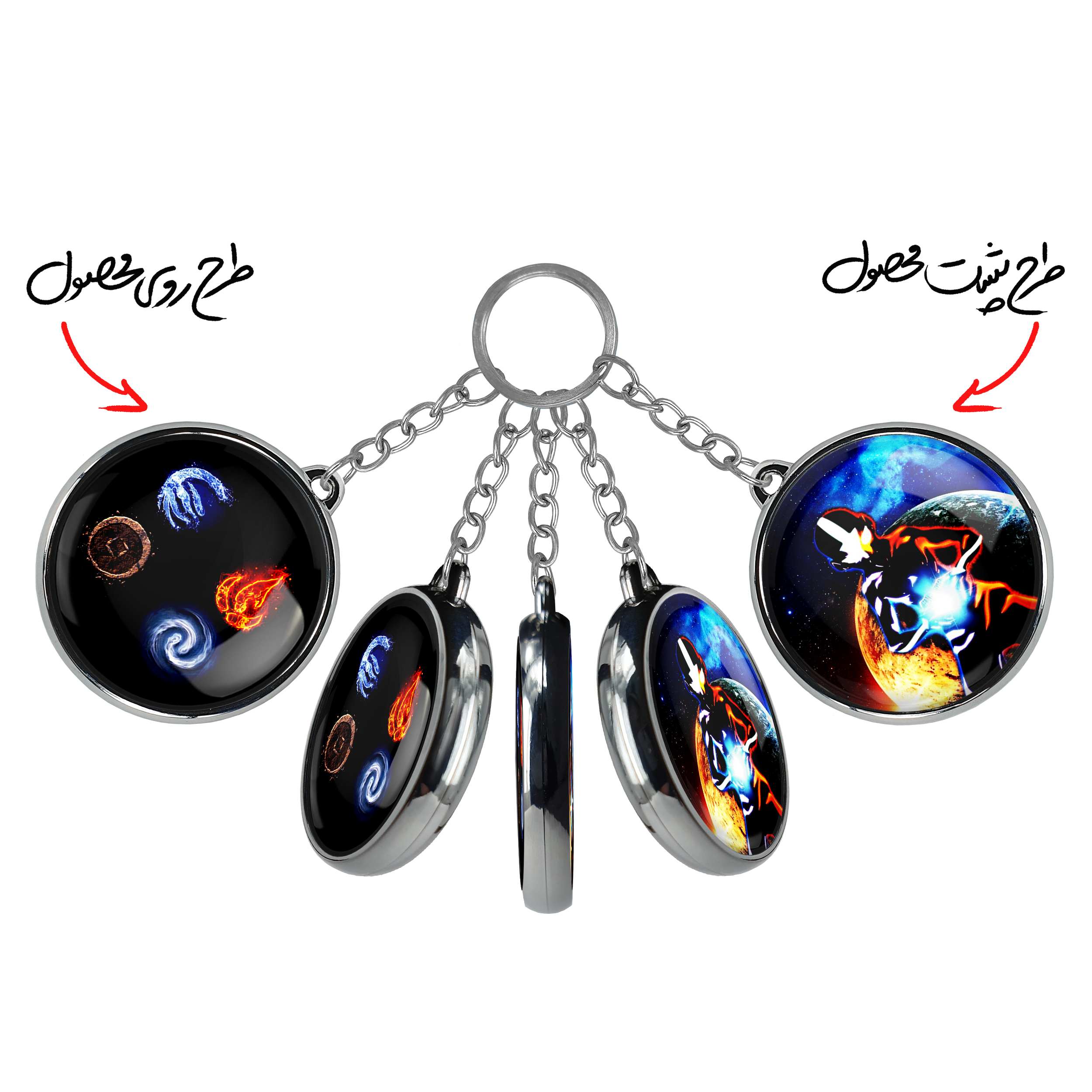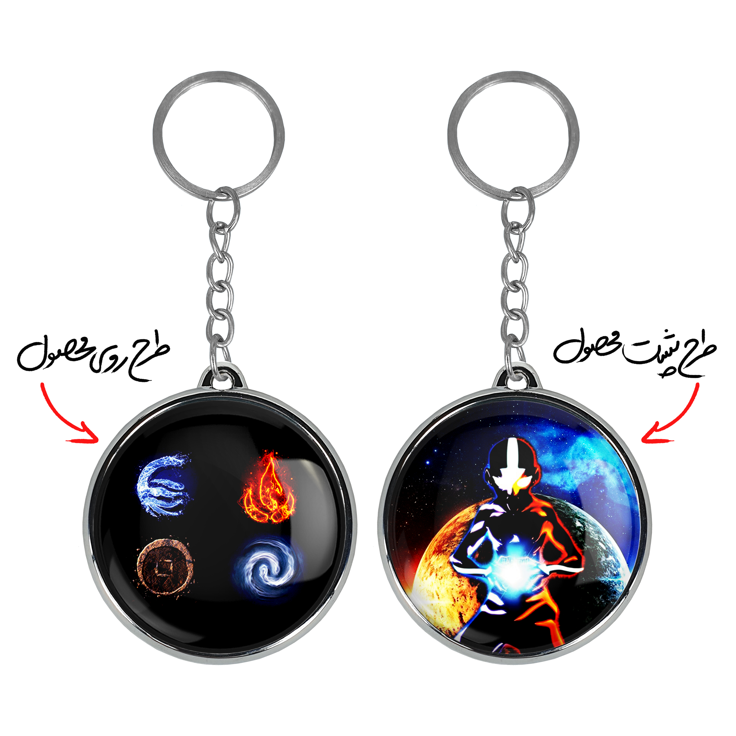 جاکلیدی دوطرفه چهار عنصر انیمه آواتار Avatar خندالو محصولی کاربردی و جدید است که در هر دو سمت محصول، تصویری متفاوت اما از یک موضوع چاپ شده و تفاوت اصلی آن با جاکلیدی های یک طرفه در همین است که هر دو سمت پشت و روی جاکلیدی، طرحی دیدنی و جذاب دارد. همچنین رینگ بکار برده شده برای دور طرح ها آبکاری کروم درجه یک و رنگ ثابت است و برخلاف سایر محصولات مشابه، از رنگ های متفرقه و یا سفید استفاده نشده، که این مهم، زیبایی محصول نهایی را چند برابر کرده است. جاکلیدی های دوطرفه چهار عنصر انیمه آواتار Avatar با استفاده از روکش سلفون براق ضدخش تولید شده که خاصیت ضدخش بودن آن عمر مفید استفاده از جاکلیدی ها را افزایش میدهد. چاپ جاکلیدی ها با دستگاه های استاندارد و با بهترین سطح کیفیت صورت گرفته و طرح با شفافیتی مثال زدنی و با سلفون چسبی تولید شده است که باعث شده محصول نهایی بدون شکست نور دیده شود. همچنین بسته بندی جذاب و مینیمال جاکلیدی دوطرفه چهار عنصر انیمه آواتار Avatar ، آنها را محصولی مناسب هدیه کرده است. زنجیر و حلقه بکار برده شده در جاکلیدی خندالو از نوع حلقه ضخیم و محکم بوده و حین استفاده آسیب نمی بیند.
