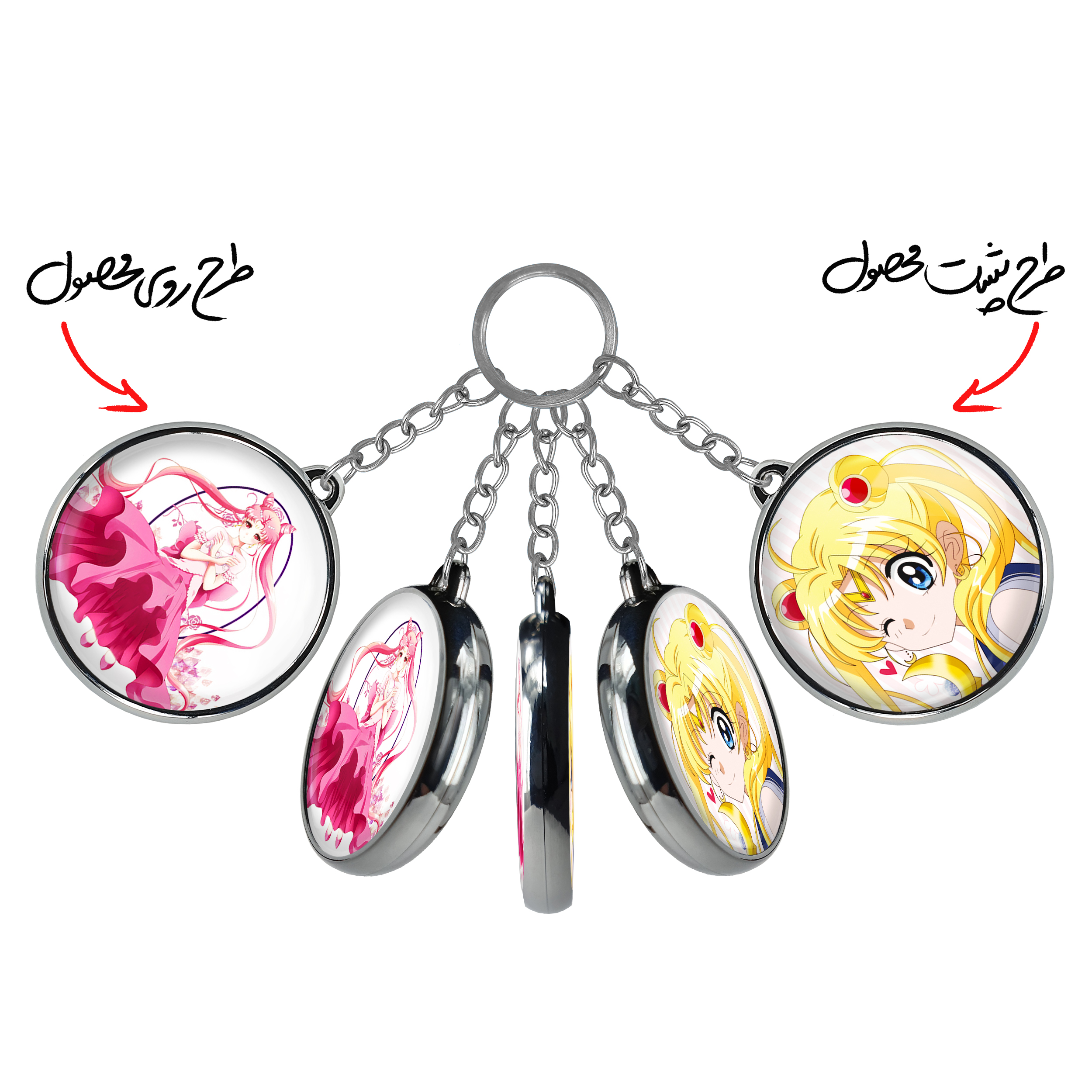 جاکلیدی دوطرفه چیبیوسا انیمه سیلور مون Sailor Moon خندالو محصولی کاربردی و جدید است که در هر دو سمت محصول، تصویری متفاوت اما از یک موضوع چاپ شده و تفاوت اصلی آن با جاکلیدی های یک طرفه در همین است که هر دو سمت پشت و روی جاکلیدی، طرحی دیدنی و جذاب دارد. همچنین رینگ بکار برده شده برای دور طرح ها آبکاری کروم درجه یک و رنگ ثابت است و برخلاف سایر محصولات مشابه، از رنگ های متفرقه و یا سفید استفاده نشده، که این مهم، زیبایی محصول نهایی را چند برابر کرده است. جاکلیدی های دوطرفه چیبیوسا انیمه سیلور مون Sailor Moon با استفاده از روکش سلفون براق ضدخش تولید شده که خاصیت ضدخش بودن آن عمر مفید استفاده از جاکلیدی ها را افزایش میدهد. چاپ جاکلیدی ها با دستگاه های استاندارد و با بهترین سطح کیفیت صورت گرفته و طرح با شفافیتی مثال زدنی و با سلفون چسبی تولید شده است که باعث شده محصول نهایی بدون شکست نور دیده شود. همچنین بسته بندی جذاب و مینیمال جاکلیدی دوطرفه چیبیوسا انیمه سیلور مون Sailor Moon ، آنها را محصولی مناسب هدیه کرده است. زنجیر و حلقه بکار برده شده در جاکلیدی خندالو از نوع حلقه ضخیم و محکم بوده و حین استفاده آسیب نمی بیند.