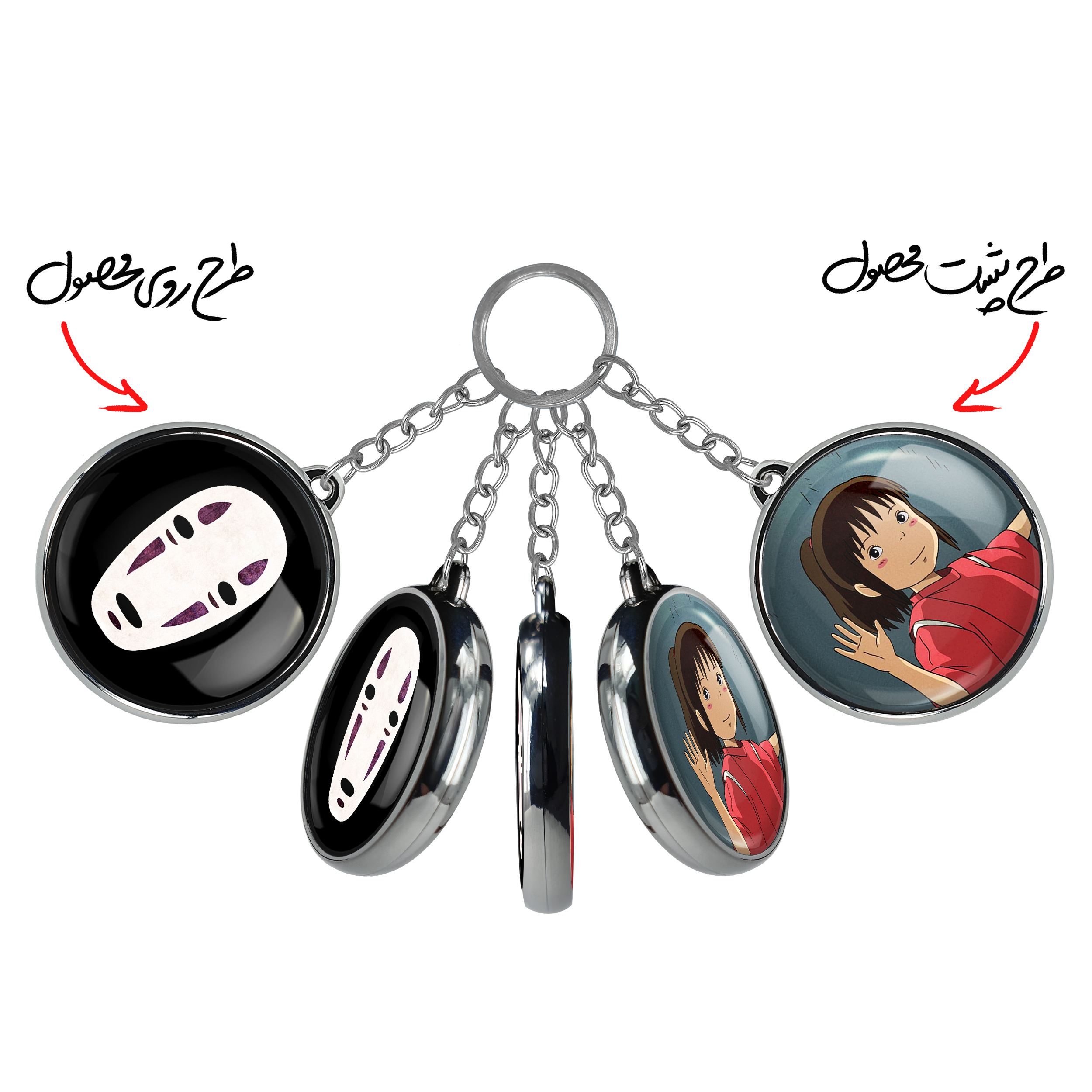 جاکلیدی دوطرفه کائوناشی انیمه شهر اشباح Spirited Away خندالو محصولی کاربردی و جدید است که در هر دو سمت محصول، تصویری متفاوت اما از یک موضوع چاپ شده و تفاوت اصلی آن با جاکلیدی های یک طرفه در همین است که هر دو سمت پشت و روی جاکلیدی، طرحی دیدنی و جذاب دارد. همچنین رینگ بکار برده شده برای دور طرح ها آبکاری کروم درجه یک و رنگ ثابت است و برخلاف سایر محصولات مشابه، از رنگ های متفرقه و یا سفید استفاده نشده، که این مهم، زیبایی محصول نهایی را چند برابر کرده است. جاکلیدی های دوطرفه کائوناشی انیمه شهر اشباح Spirited Away با استفاده از روکش سلفون براق ضدخش تولید شده که خاصیت ضدخش بودن آن عمر مفید استفاده از جاکلیدی ها را افزایش میدهد. چاپ جاکلیدی ها با دستگاه های استاندارد و با بهترین سطح کیفیت صورت گرفته و طرح با شفافیتی مثال زدنی و با سلفون چسبی تولید شده است که باعث شده محصول نهایی بدون شکست نور دیده شود. همچنین بسته بندی جذاب و مینیمال جاکلیدی دوطرفه کائوناشی انیمه شهر اشباح Spirited Away ، آنها را محصولی مناسب هدیه کرده است. زنجیر و حلقه بکار برده شده در جاکلیدی خندالو از نوع حلقه ضخیم و محکم بوده و حین استفاده آسیب نمی بیند.