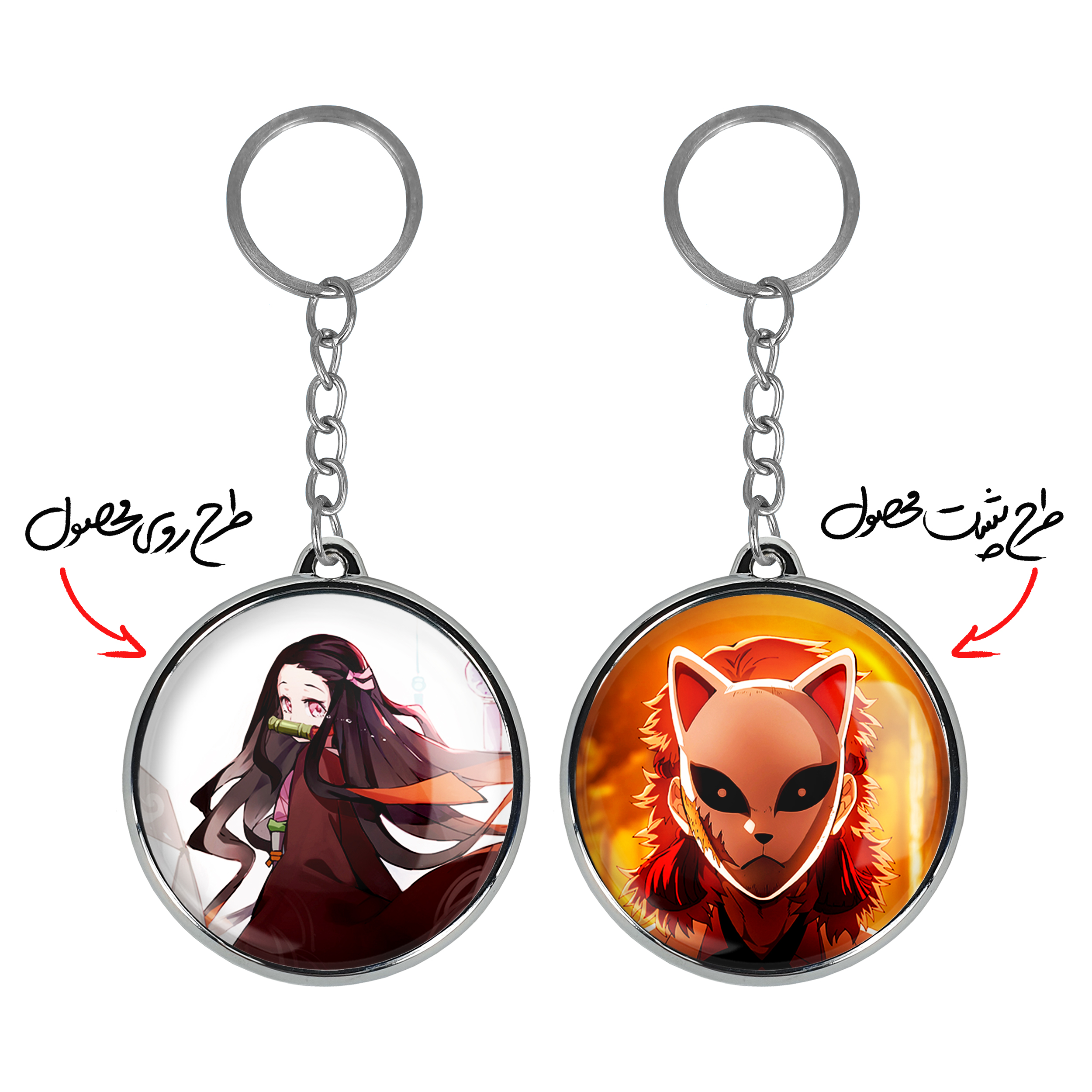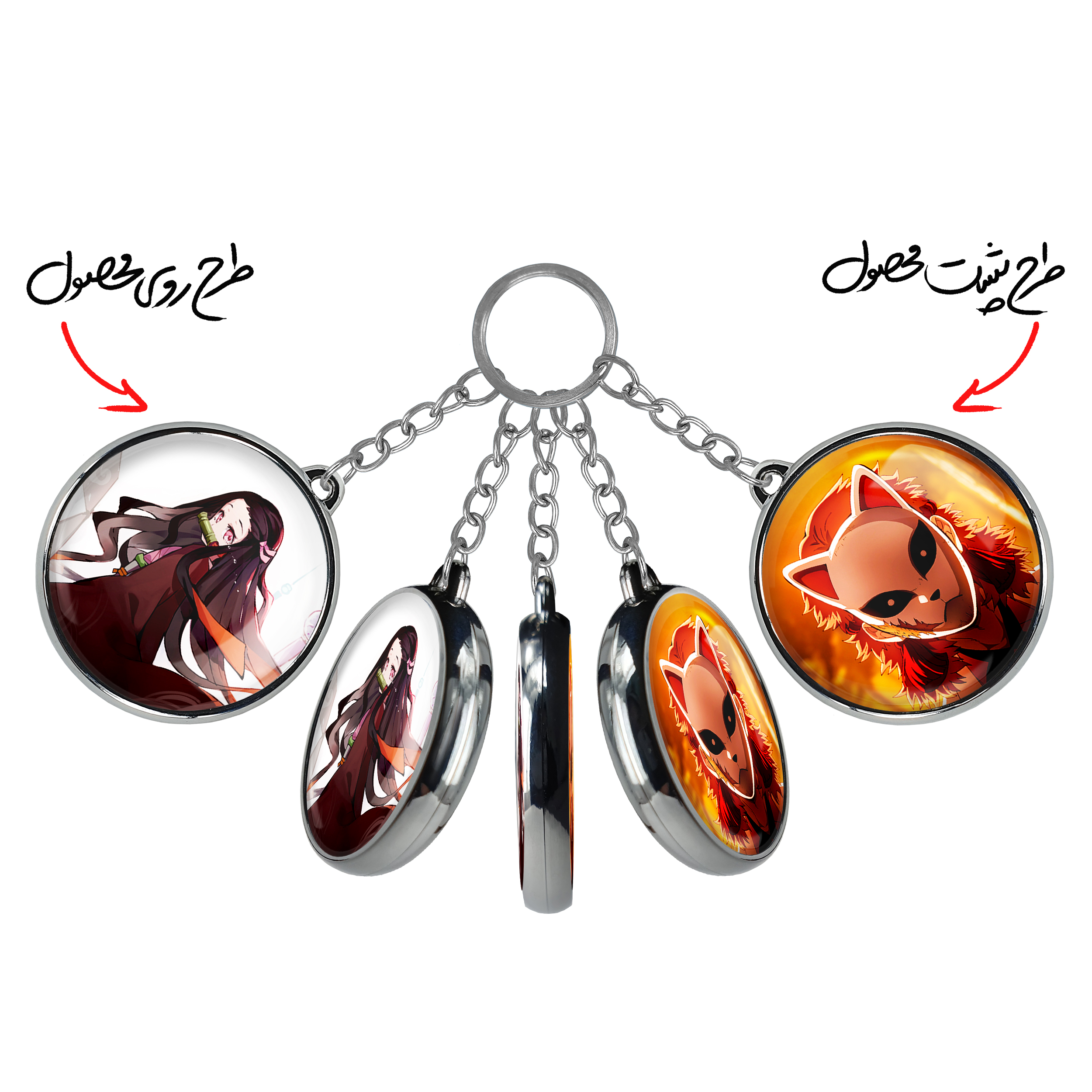 جاکلیدی دوطرفه کامادو زنیتسو انیمه شیطان کش خندالو محصولی کاربردی و جدید است که در هر دو سمت محصول، تصویری متفاوت اما از یک موضوع چاپ شده و تفاوت اصلی آن با جاکلیدی های یک طرفه در همین است که هر دو سمت پشت و روی جاکلیدی، طرحی دیدنی و جذاب دارد. همچنین رینگ بکار برده شده برای دور طرح ها آبکاری کروم درجه یک و رنگ ثابت است و برخلاف سایر محصولات مشابه، از رنگ های متفرقه و یا سفید استفاده نشده، که این مهم، زیبایی محصول نهایی را چند برابر کرده است. جاکلیدی های دوطرفه کامادو زنیتسو انیمه شیطان کش با استفاده از روکش سلفون براق ضدخش تولید شده که خاصیت ضدخش بودن آن عمر مفید استفاده از جاکلیدی ها را افزایش میدهد. چاپ جاکلیدی ها با دستگاه های استاندارد و با بهترین سطح کیفیت صورت گرفته و طرح با شفافیتی مثال زدنی و با سلفون چسبی تولید شده است که باعث شده محصول نهایی بدون شکست نور دیده شود. همچنین بسته بندی جذاب و مینیمال جاکلیدی دوطرفه کامادو زنیتسو انیمه شیطان کش ، آنها را محصولی مناسب هدیه کرده است. زنجیر و حلقه بکار برده شده در جاکلیدی خندالو از نوع حلقه ضخیم و محکم بوده و حین استفاده آسیب نمی بیند.
