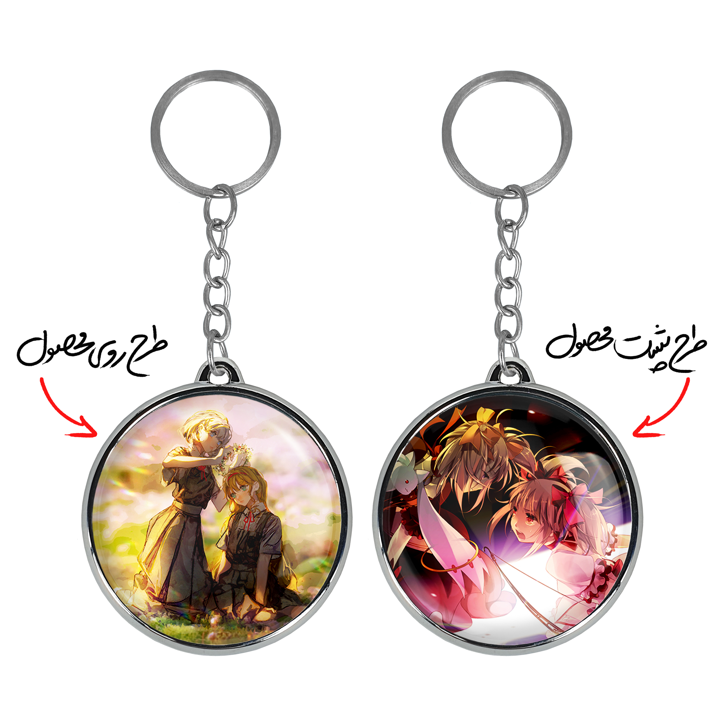 جاکلیدی دوطرفه کاکه و سومیره انیمه مادوکا مجیکا Madoka Magica خندالو محصولی کاربردی و جدید است که در هر دو سمت محصول، تصویری متفاوت اما از یک موضوع چاپ شده و تفاوت اصلی آن با جاکلیدی های یک طرفه در همین است که هر دو سمت پشت و روی جاکلیدی، طرحی دیدنی و جذاب دارد. همچنین رینگ بکار برده شده برای دور طرح ها آبکاری کروم درجه یک و رنگ ثابت است و برخلاف سایر محصولات مشابه، از رنگ های متفرقه و یا سفید استفاده نشده، که این مهم، زیبایی محصول نهایی را چند برابر کرده است. جاکلیدی های دوطرفه کاکه و سومیره انیمه مادوکا مجیکا Madoka Magica با استفاده از روکش سلفون براق ضدخش تولید شده که خاصیت ضدخش بودن آن عمر مفید استفاده از جاکلیدی ها را افزایش میدهد. چاپ جاکلیدی ها با دستگاه های استاندارد و با بهترین سطح کیفیت صورت گرفته و طرح با شفافیتی مثال زدنی و با سلفون چسبی تولید شده است که باعث شده محصول نهایی بدون شکست نور دیده شود. همچنین بسته بندی جذاب و مینیمال جاکلیدی دوطرفه کاکه و سومیره انیمه مادوکا مجیکا Madoka Magica ، آنها را محصولی مناسب هدیه کرده است. زنجیر و حلقه بکار برده شده در جاکلیدی خندالو از نوع حلقه ضخیم و محکم بوده و حین استفاده آسیب نمی بیند.
