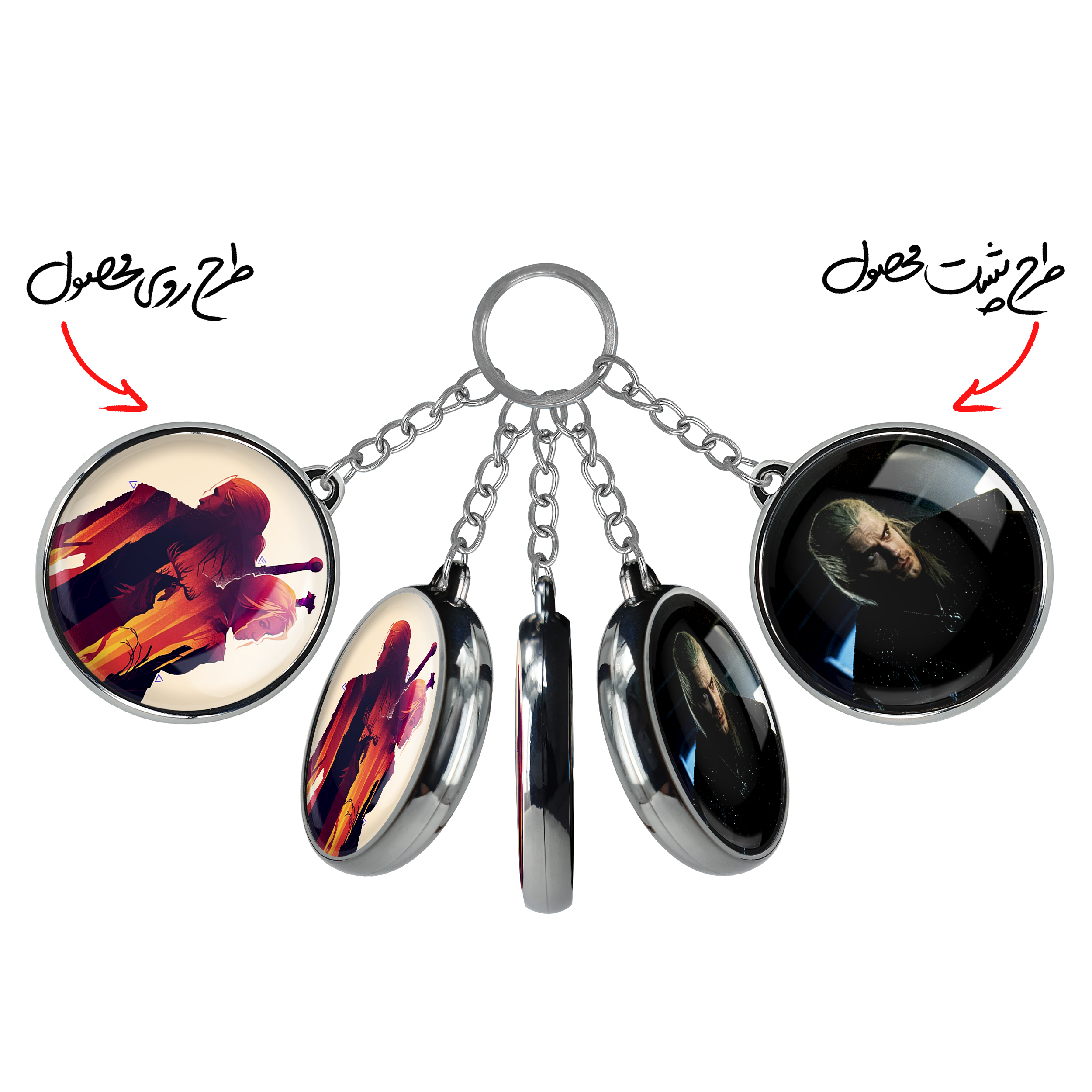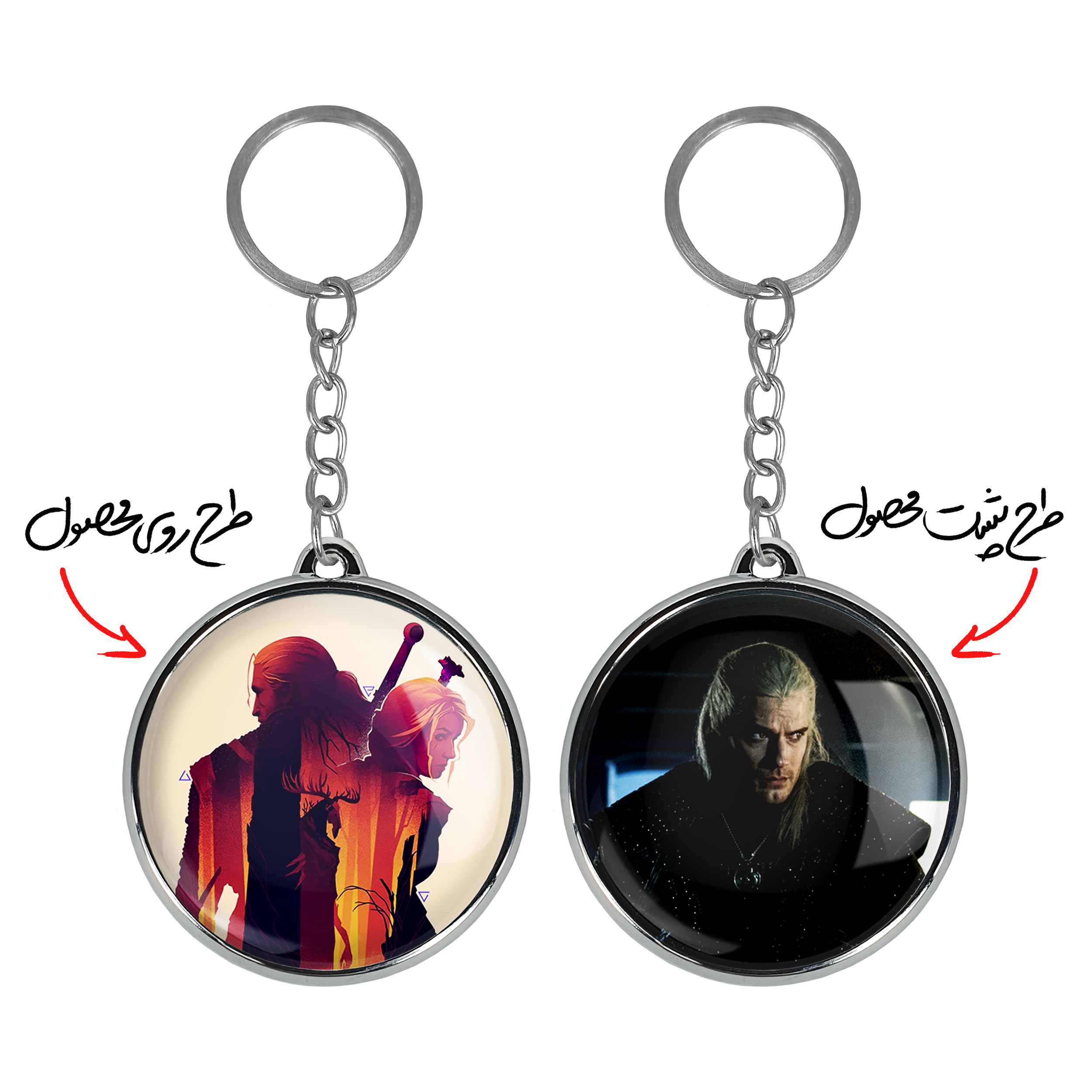 جاکلیدی دوطرفه گرالت و سیری سریال ویچر Witcherخندالو محصولی کاربردی و جدید است که در هر دو سمت محصول، تصویری متفاوت اما از یک موضوع چاپ شده و تفاوت اصلی آن با جاکلیدی های یک طرفه در همین است که هر دو سمت پشت و روی جاکلیدی، طرحی دیدنی و جذاب دارد. همچنین رینگ بکار برده شده برای دور طرح ها آبکاری کروم درجه یک و رنگ ثابت است و برخلاف سایر محصولات مشابه، از رنگ های متفرقه و یا سفید استفاده نشده، که این مهم، زیبایی محصول نهایی را چند برابر کرده است. جاکلیدی های دوطرفه گرالت و سیری سریال ویچر Witcherبا استفاده از روکش سلفون براق ضدخش تولید شده که خاصیت ضدخش بودن آن عمر مفید استفاده از جاکلیدی ها را افزایش میدهد. چاپ جاکلیدی ها با دستگاه های استاندارد و با بهترین سطح کیفیت صورت گرفته و طرح با شفافیتی مثال زدنی و با سلفون چسبی تولید شده است که باعث شده محصول نهایی بدون شکست نور دیده شود. همچنین بسته بندی جذاب و مینیمال جاکلیدی دوطرفه گرالت و سیری سریال ویچر Witcher، آنها را محصولی مناسب هدیه کرده است. زنجیر و حلقه بکار برده شده در جاکلیدی خندالو از نوع حلقه ضخیم و محکم بوده و حین استفاده آسیب نمی بیند.