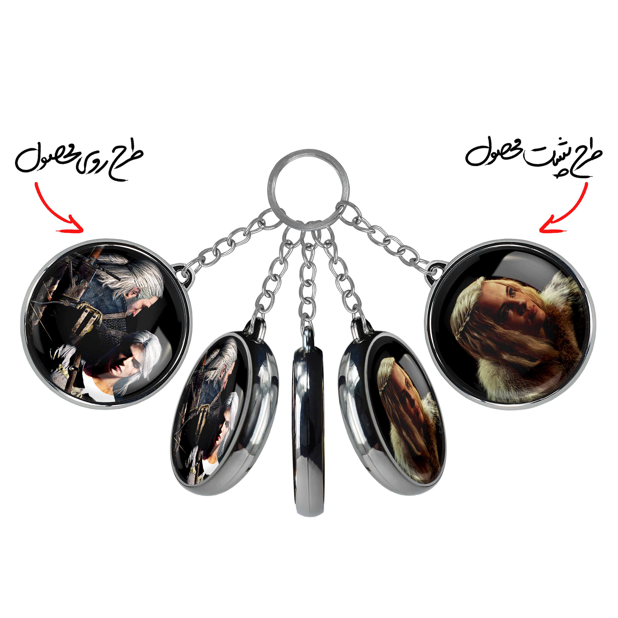 جاکلیدی دوطرفه گرالت و ینفر سریال ویچر Witcherخندالو محصولی کاربردی و جدید است که در هر دو سمت محصول، تصویری متفاوت اما از یک موضوع چاپ شده و تفاوت اصلی آن با جاکلیدی های یک طرفه در همین است که هر دو سمت پشت و روی جاکلیدی، طرحی دیدنی و جذاب دارد. همچنین رینگ بکار برده شده برای دور طرح ها آبکاری کروم درجه یک و رنگ ثابت است و برخلاف سایر محصولات مشابه، از رنگ های متفرقه و یا سفید استفاده نشده، که این مهم، زیبایی محصول نهایی را چند برابر کرده است. جاکلیدی های دوطرفه گرالت و ینفر سریال ویچر Witcherبا استفاده از روکش سلفون براق ضدخش تولید شده که خاصیت ضدخش بودن آن عمر مفید استفاده از جاکلیدی ها را افزایش میدهد. چاپ جاکلیدی ها با دستگاه های استاندارد و با بهترین سطح کیفیت صورت گرفته و طرح با شفافیتی مثال زدنی و با سلفون چسبی تولید شده است که باعث شده محصول نهایی بدون شکست نور دیده شود. همچنین بسته بندی جذاب و مینیمال جاکلیدی دوطرفه گرالت و ینفر سریال ویچر Witcher، آنها را محصولی مناسب هدیه کرده است. زنجیر و حلقه بکار برده شده در جاکلیدی خندالو از نوع حلقه ضخیم و محکم بوده و حین استفاده آسیب نمی بیند.