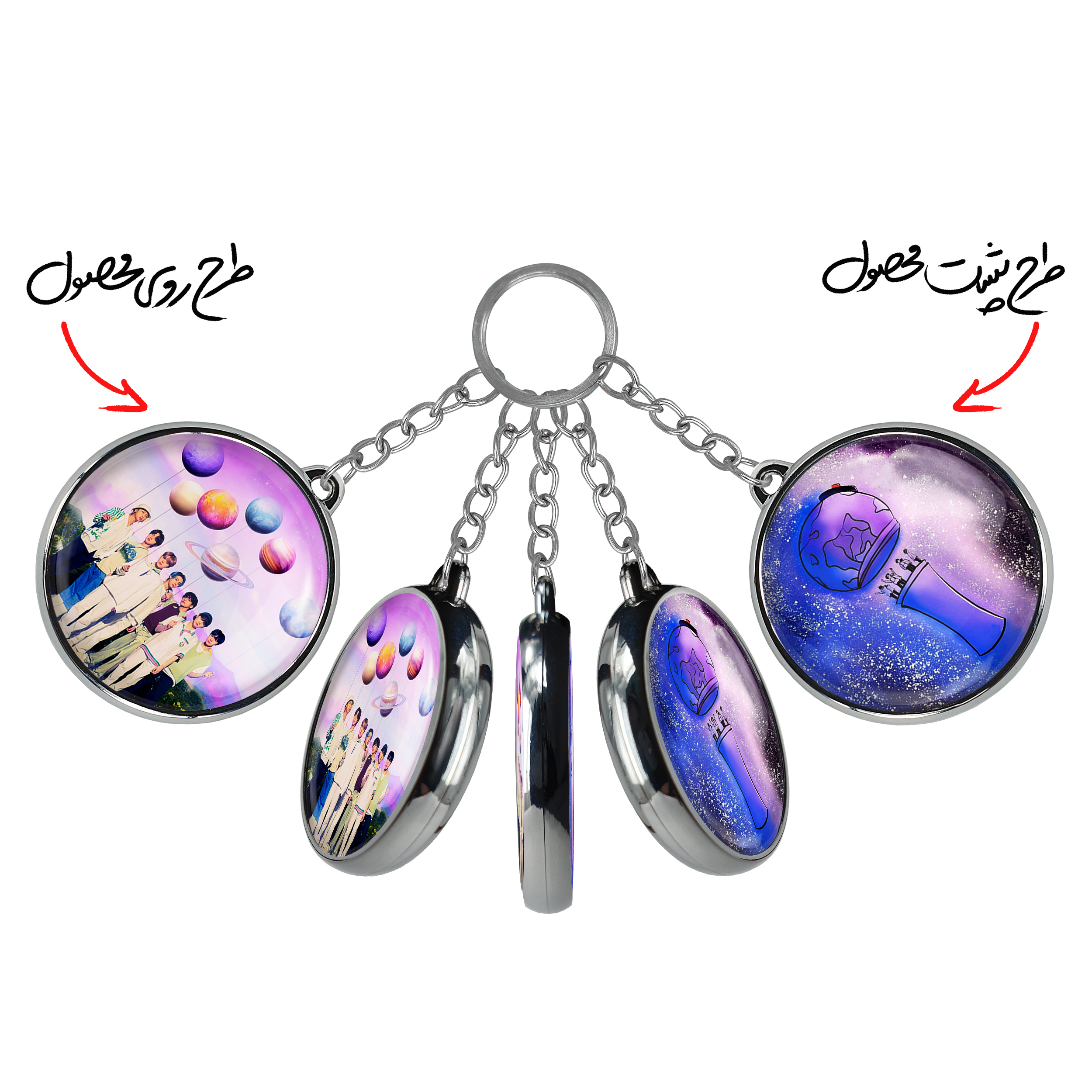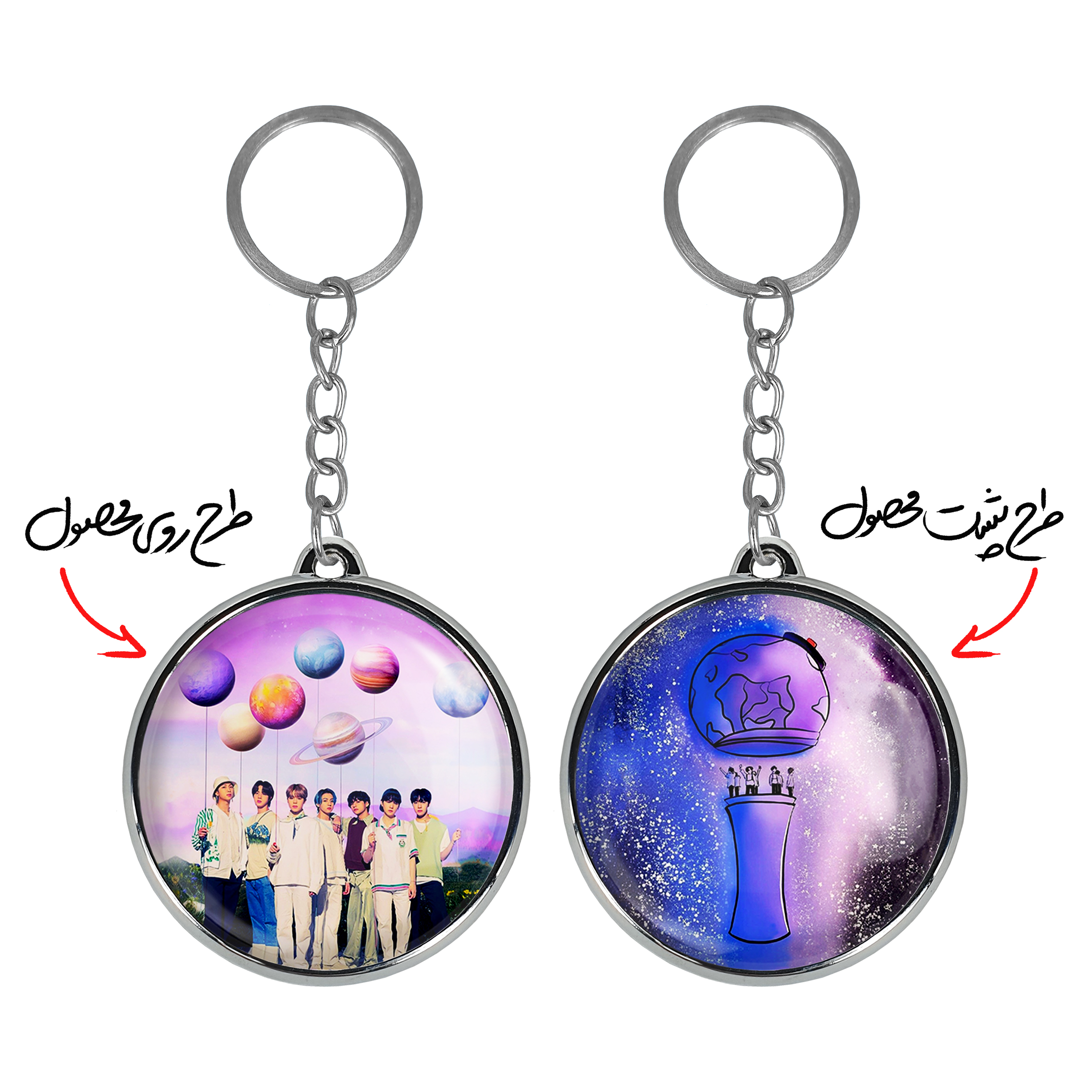 جاکلیدی دوطرفه گروه بی تی اس BTSخندالو محصولی کاربردی و جدید است که در هر دو سمت محصول، تصویری متفاوت اما از یک موضوع چاپ شده و تفاوت اصلی آن با جاکلیدی های یک طرفه در همین است که هر دو سمت پشت و روی جاکلیدی، طرحی دیدنی و جذاب دارد.