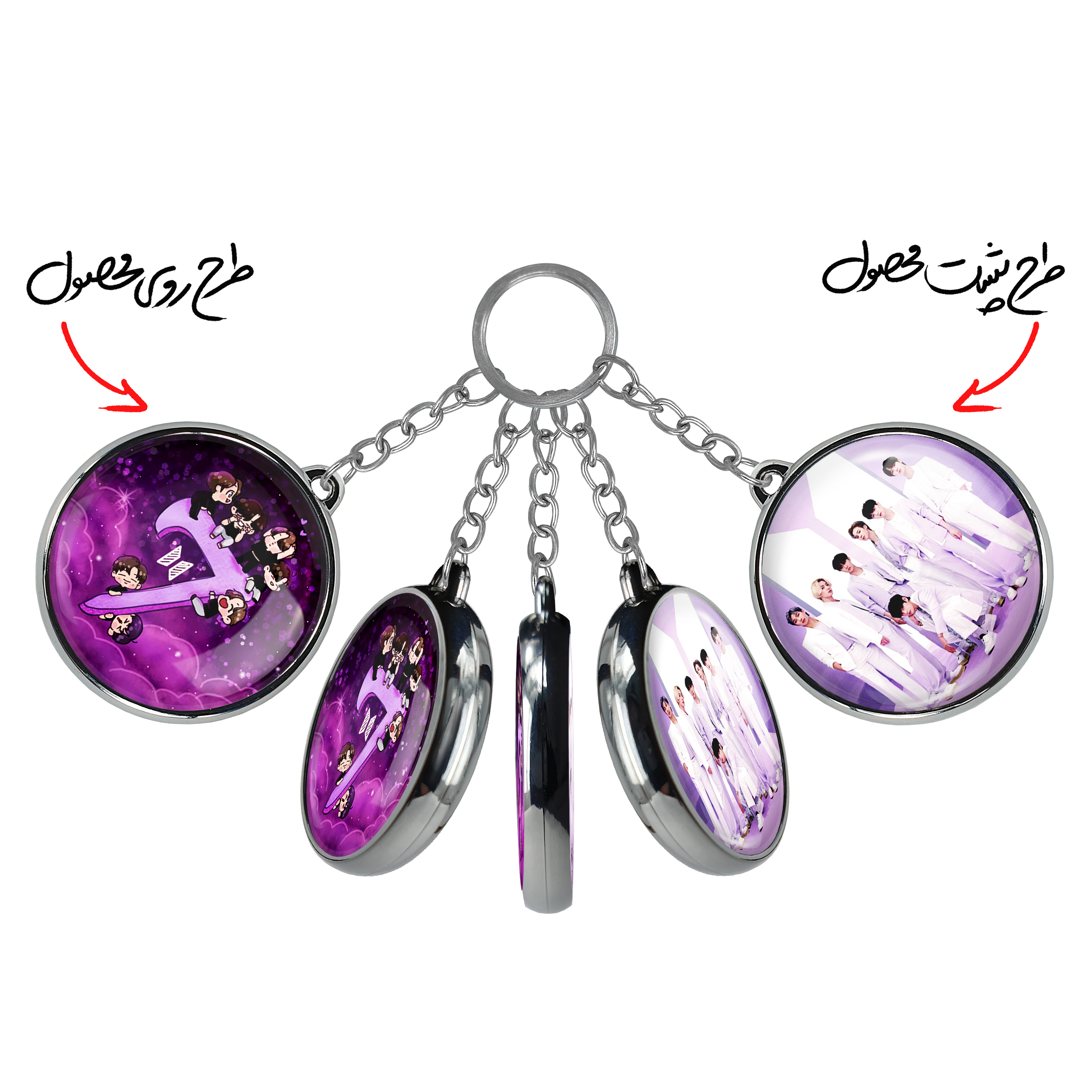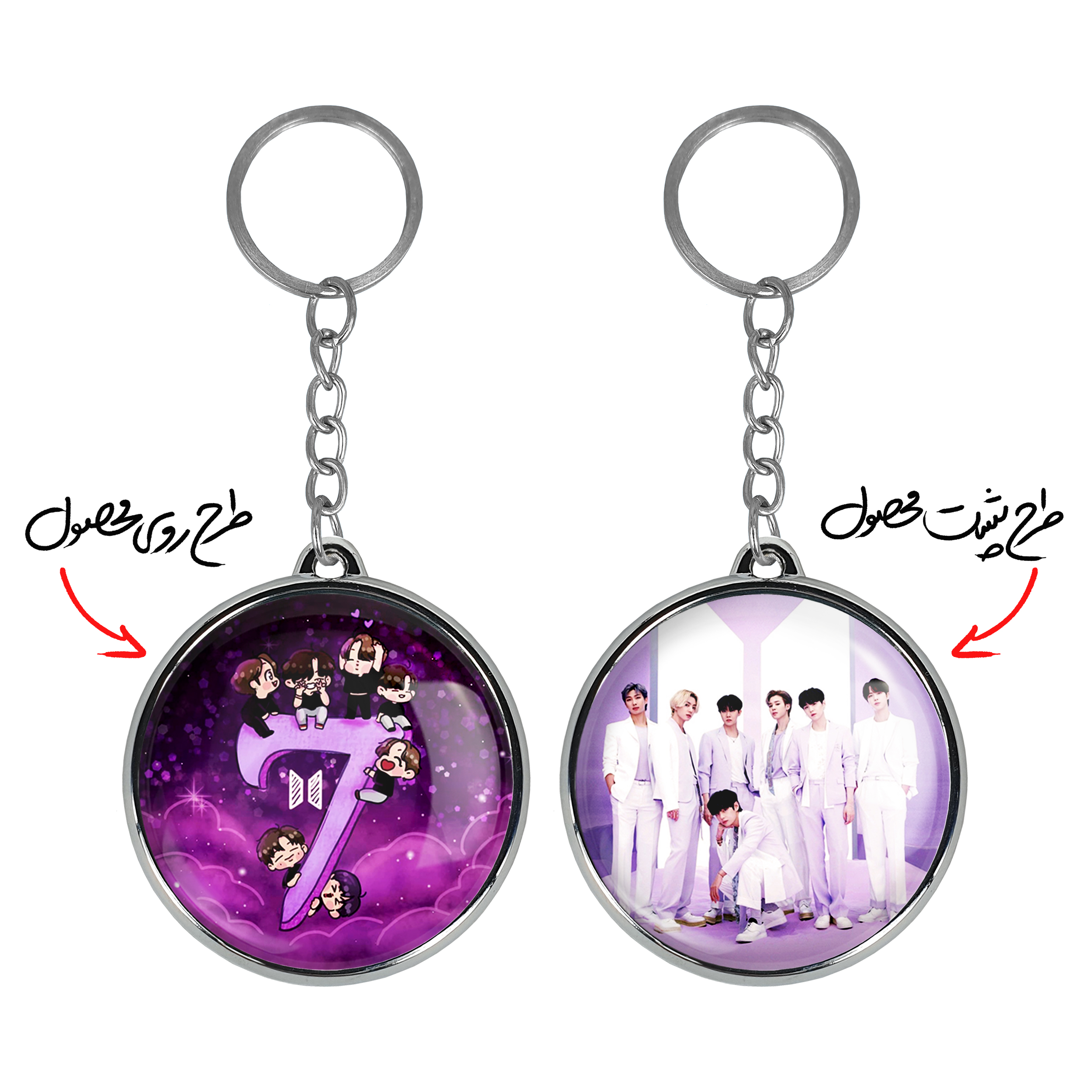 جاکلیدی دوطرفه گروه بی تی اس BTSخندالو محصولی کاربردی و جدید است که در هر دو سمت محصول، تصویری متفاوت اما از یک موضوع چاپ شده و تفاوت اصلی آن با جاکلیدی های یک طرفه در همین است که هر دو سمت پشت و روی جاکلیدی، طرحی دیدنی و جذاب دارد.