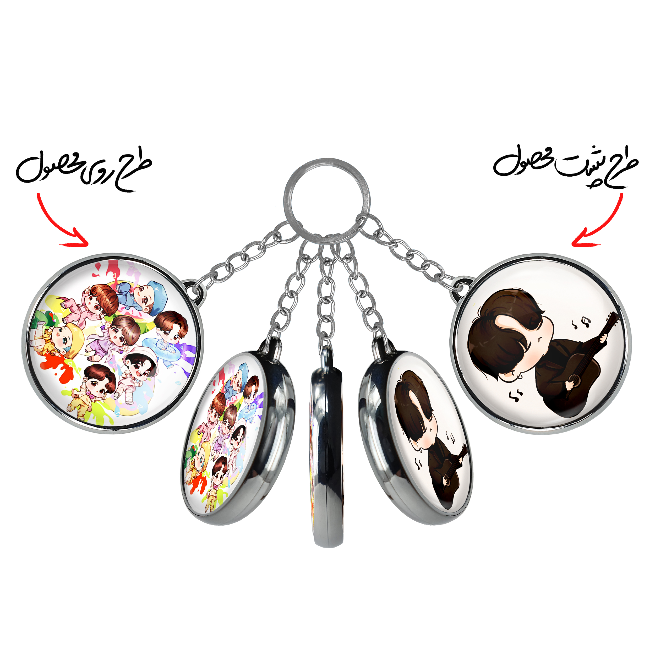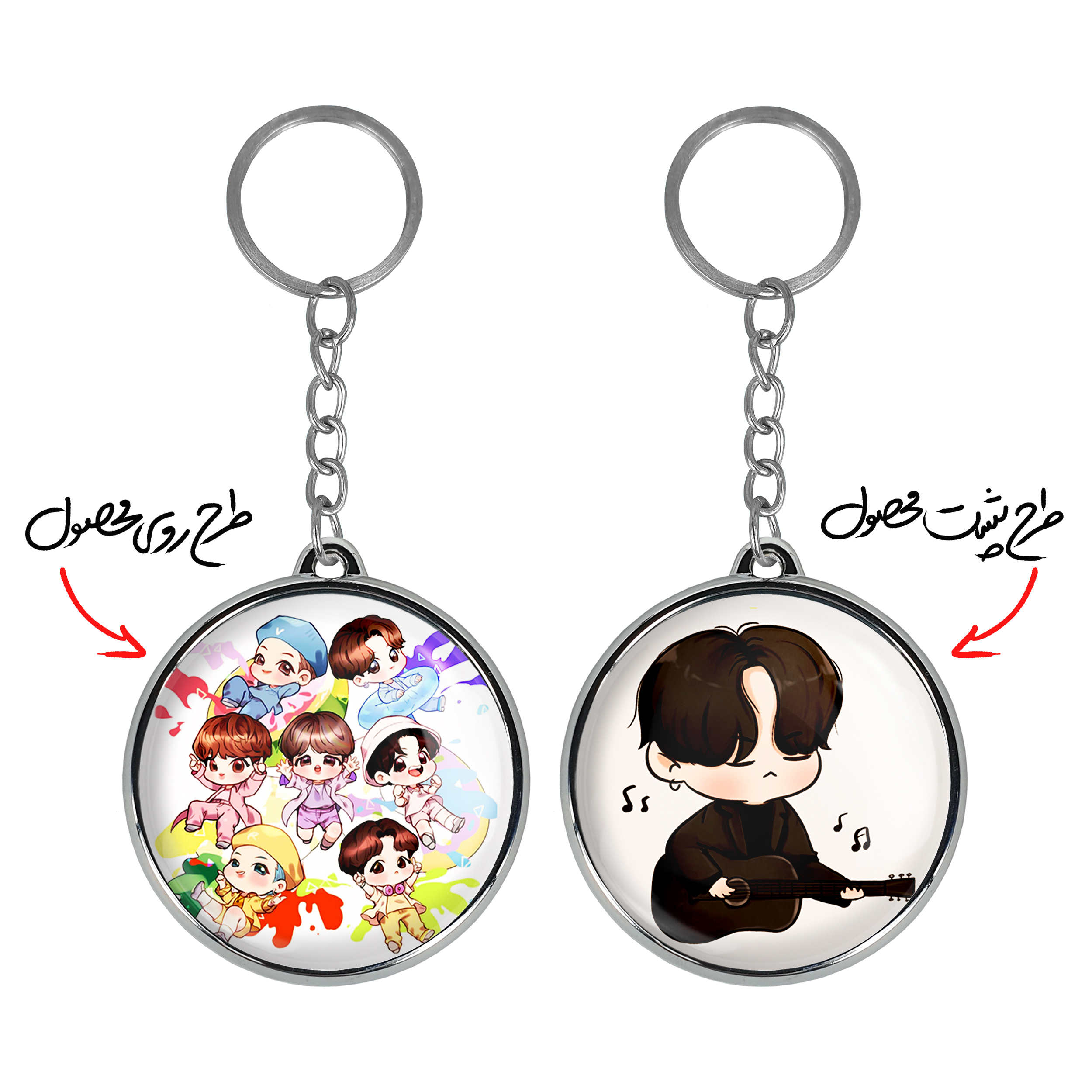 جاکلیدی دوطرفه گروه بی تی اس BTSخندالو محصولی کاربردی و جدید است که در هر دو سمت محصول، تصویری متفاوت اما از یک موضوع چاپ شده و تفاوت اصلی آن با جاکلیدی های یک طرفه در همین است که هر دو سمت پشت و روی جاکلیدی، طرحی دیدنی و جذاب دارد.