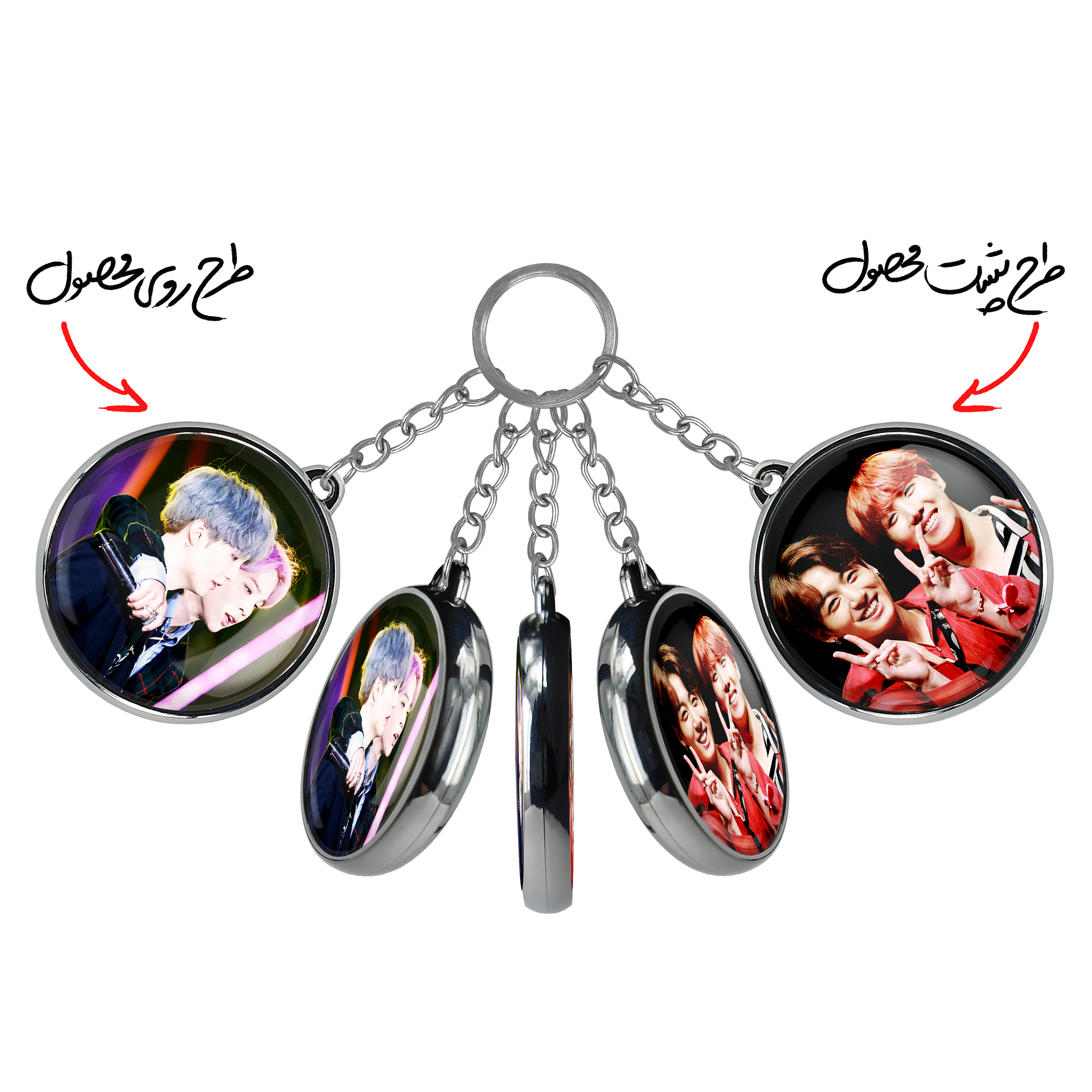 جاکلیدی دوطرفه گروه بی تی اس BTSخندالو محصولی کاربردی و جدید است که در هر دو سمت محصول، تصویری متفاوت اما از یک موضوع چاپ شده و تفاوت اصلی آن با جاکلیدی های یک طرفه در همین است که هر دو سمت پشت و روی جاکلیدی، طرحی دیدنی و جذاب دارد.