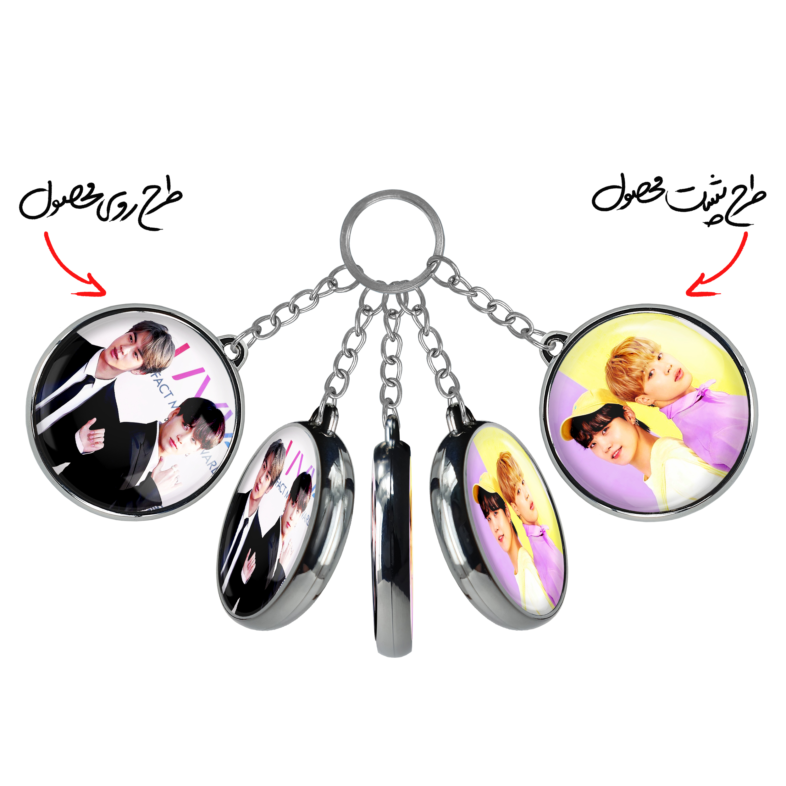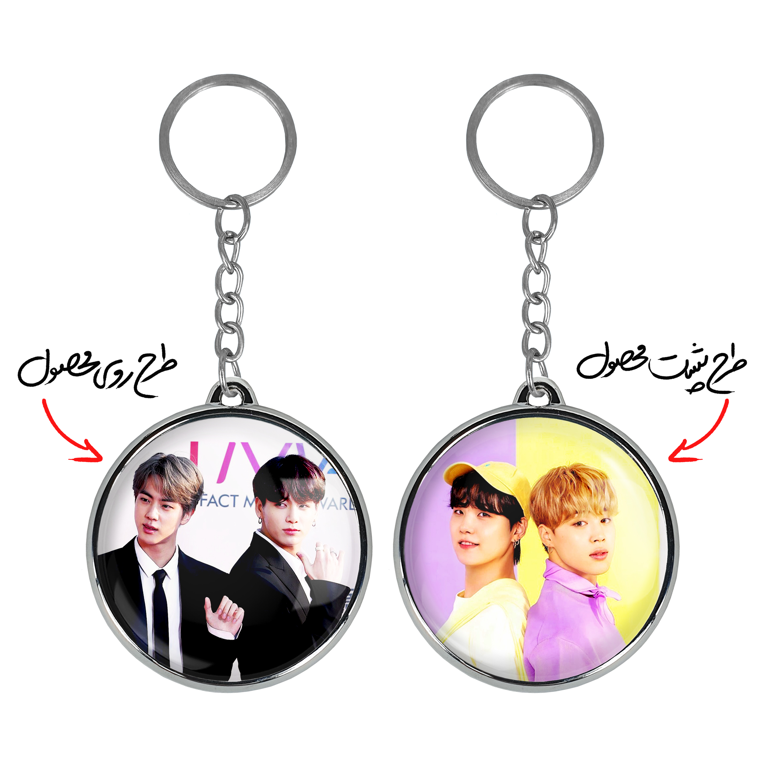 جاکلیدی دوطرفه گروه بی تی اس BTSخندالو محصولی کاربردی و جدید است که در هر دو سمت محصول، تصویری متفاوت اما از یک موضوع چاپ شده و تفاوت اصلی آن با جاکلیدی های یک طرفه در همین است که هر دو سمت پشت و روی جاکلیدی، طرحی دیدنی و جذاب دارد.