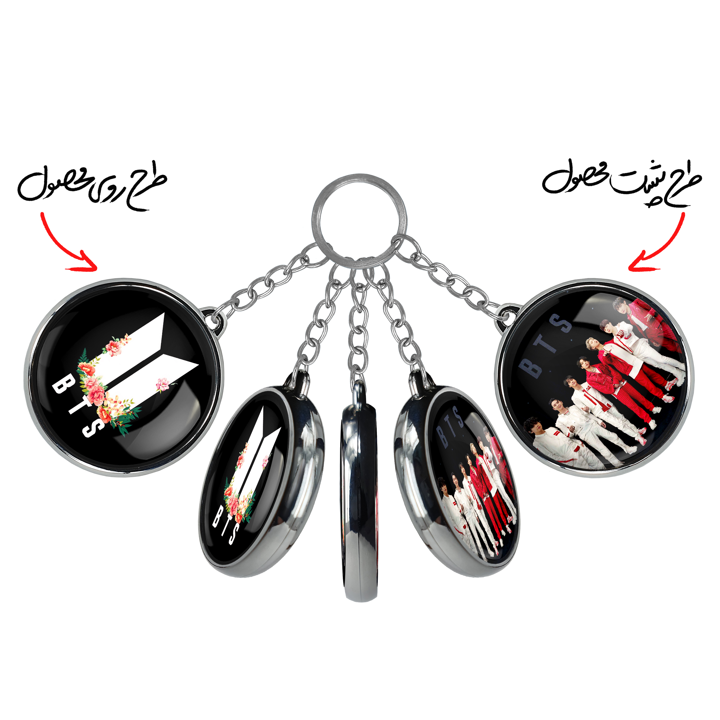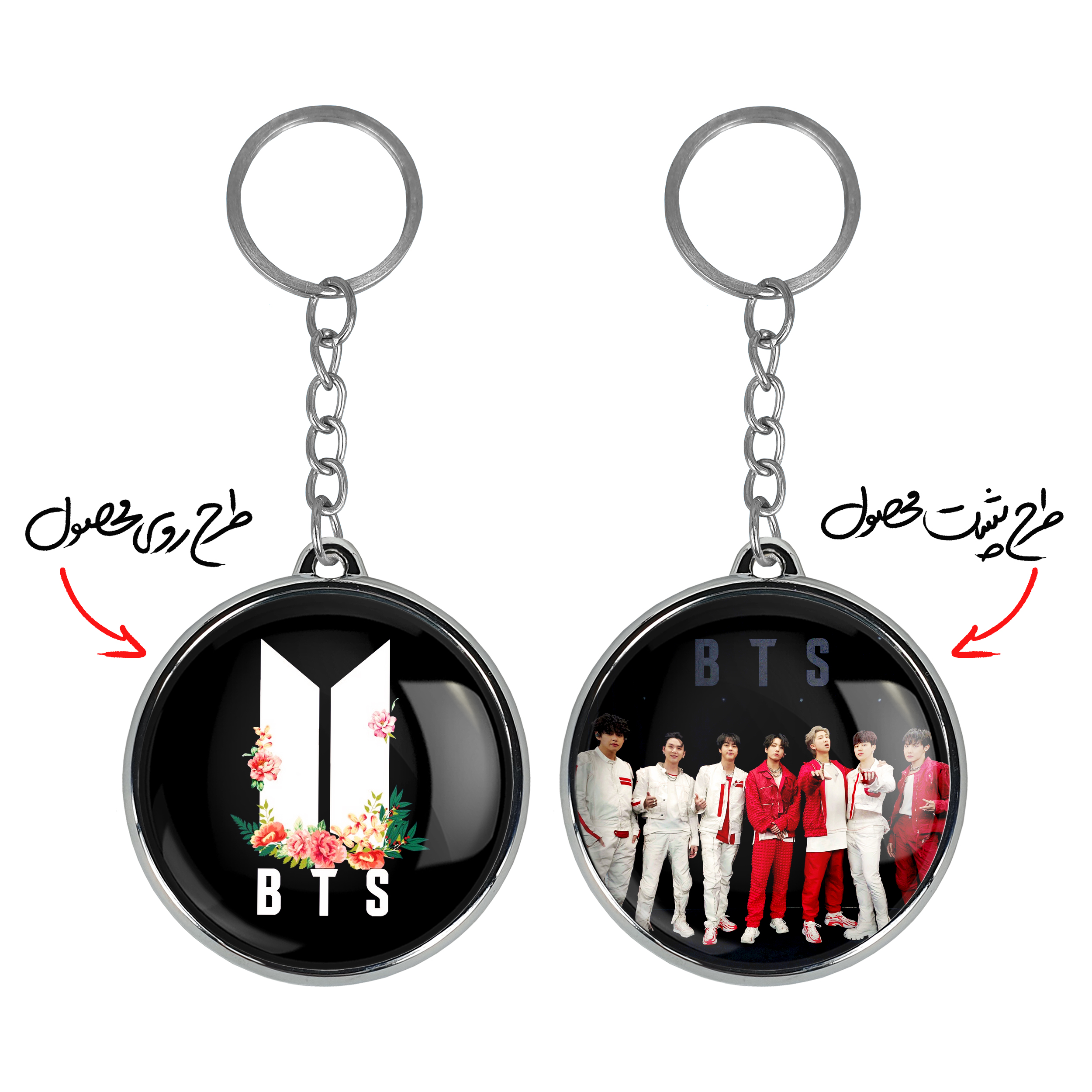 جاکلیدی دوطرفه گروه بی تی اس BTSخندالو محصولی کاربردی و جدید است که در هر دو سمت محصول، تصویری متفاوت اما از یک موضوع چاپ شده و تفاوت اصلی آن با جاکلیدی های یک طرفه در همین است که هر دو سمت پشت و روی جاکلیدی، طرحی دیدنی و جذاب دارد.