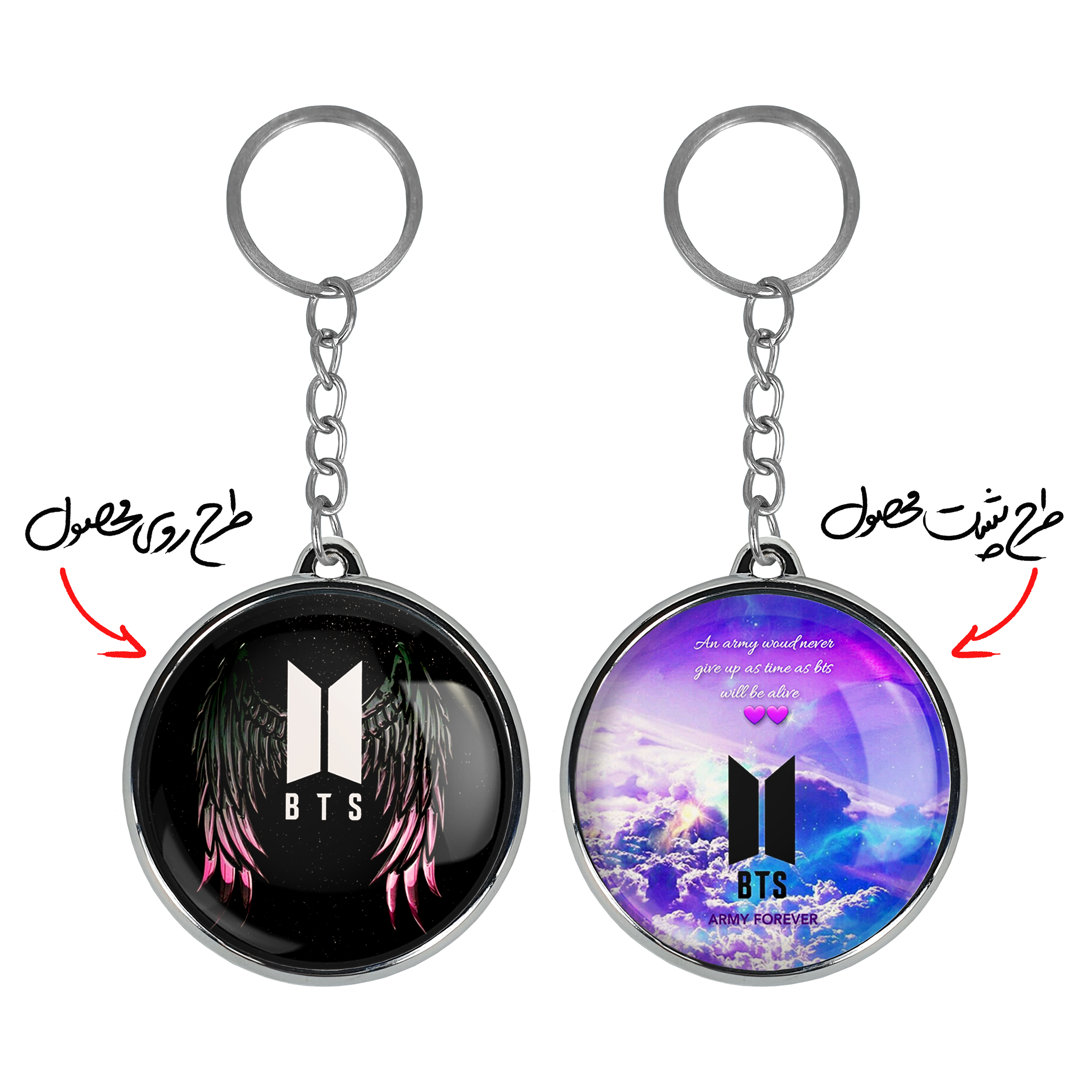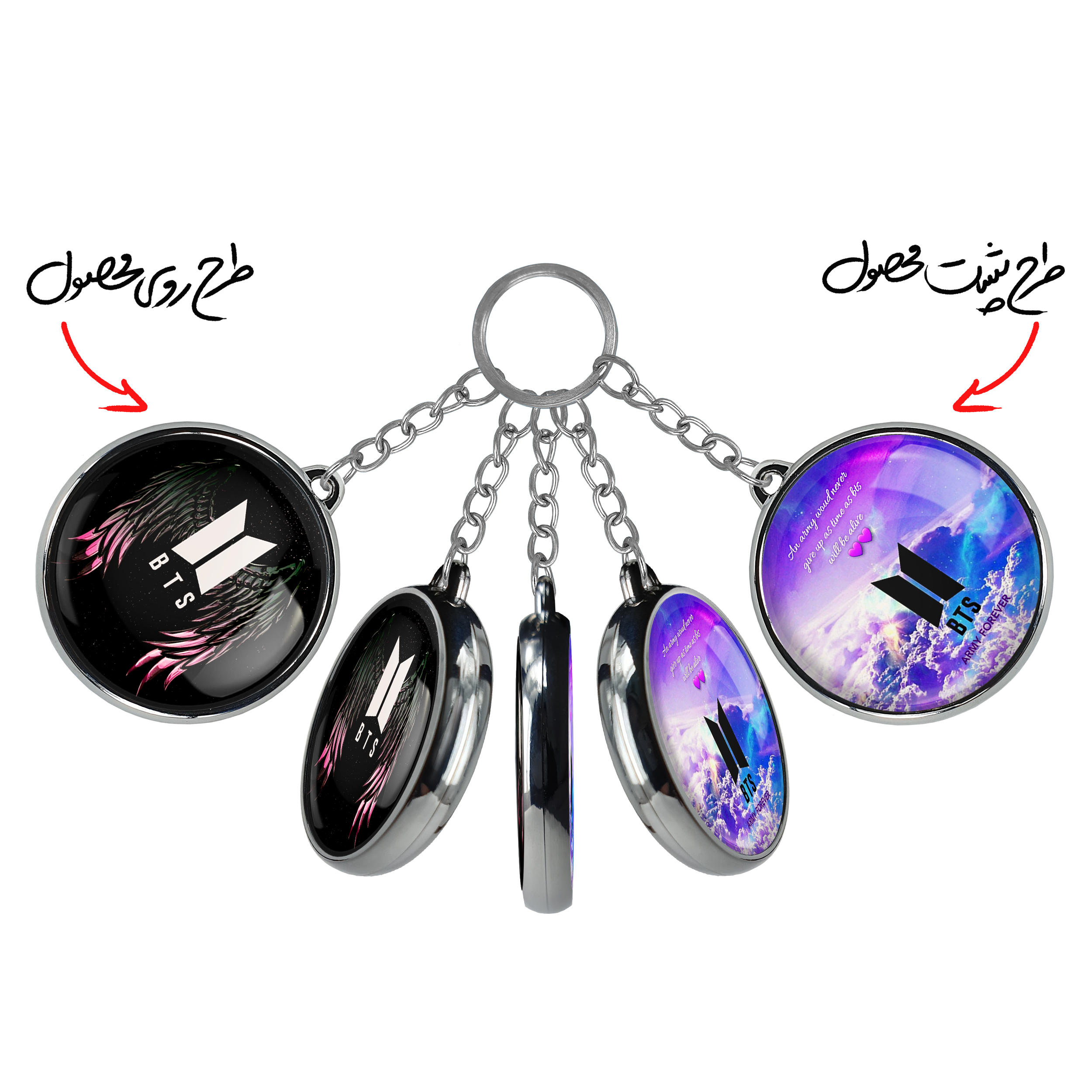 جاکلیدی دوطرفه گروه بی تی اس BTSخندالو محصولی کاربردی و جدید است که در هر دو سمت محصول، تصویری متفاوت اما از یک موضوع چاپ شده و تفاوت اصلی آن با جاکلیدی های یک طرفه در همین است که هر دو سمت پشت و روی جاکلیدی، طرحی دیدنی و جذاب دارد.