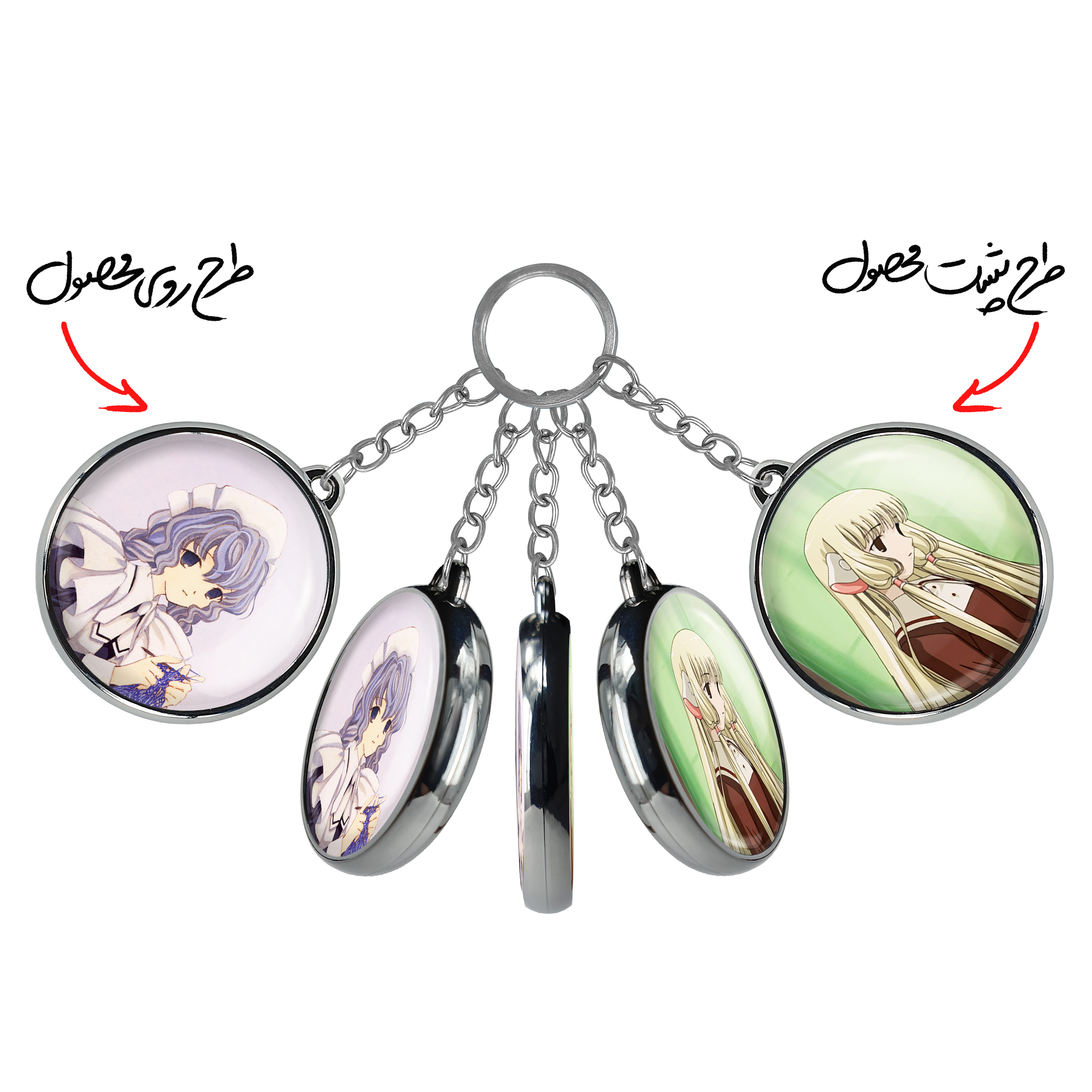 جاکلیدی دوطرفه یوزوکی انیمه چوبیتس Chobits خندالو محصولی کاربردی و جدید است که در هر دو سمت محصول، تصویری متفاوت اما از یک موضوع چاپ شده و تفاوت اصلی آن با جاکلیدی های یک طرفه در همین است که هر دو سمت پشت و روی جاکلیدی، طرحی دیدنی و جذاب دارد. همچنین رینگ بکار برده شده برای دور طرح ها آبکاری کروم درجه یک و رنگ ثابت است و برخلاف سایر محصولات مشابه، از رنگ های متفرقه و یا سفید استفاده نشده، که این مهم، زیبایی محصول نهایی را چند برابر کرده است. جاکلیدی های دوطرفه یوزوکی انیمه چوبیتس Chobits با استفاده از روکش سلفون براق ضدخش تولید شده که خاصیت ضدخش بودن آن عمر مفید استفاده از جاکلیدی ها را افزایش میدهد. چاپ جاکلیدی ها با دستگاه های استاندارد و با بهترین سطح کیفیت صورت گرفته و طرح با شفافیتی مثال زدنی و با سلفون چسبی تولید شده است که باعث شده محصول نهایی بدون شکست نور دیده شود. همچنین بسته بندی جذاب و مینیمال جاکلیدی دوطرفه یوزوکی انیمه چوبیتس Chobits ، آنها را محصولی مناسب هدیه کرده است. زنجیر و حلقه بکار برده شده در جاکلیدی خندالو از نوع حلقه ضخیم و محکم بوده و حین استفاده آسیب نمی بیند.