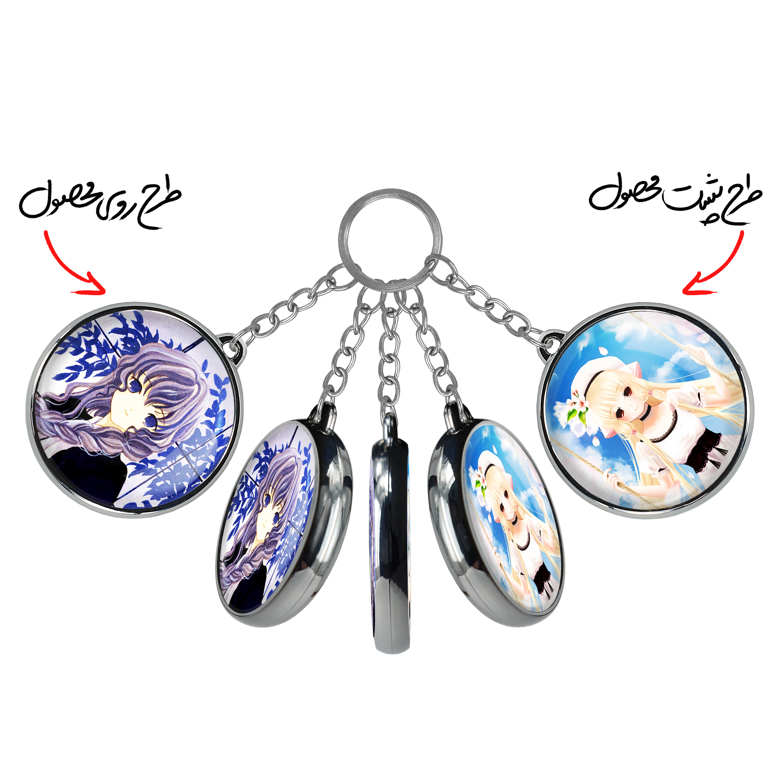 جاکلیدی دوطرفه یوزوکی انیمه چوبیتس Chobits خندالو محصولی کاربردی و جدید است که در هر دو سمت محصول، تصویری متفاوت اما از یک موضوع چاپ شده و تفاوت اصلی آن با جاکلیدی های یک طرفه در همین است که هر دو سمت پشت و روی جاکلیدی، طرحی دیدنی و جذاب دارد. همچنین رینگ بکار برده شده برای دور طرح ها آبکاری کروم درجه یک و رنگ ثابت است و برخلاف سایر محصولات مشابه، از رنگ های متفرقه و یا سفید استفاده نشده، که این مهم، زیبایی محصول نهایی را چند برابر کرده است. جاکلیدی های دوطرفه یوزوکی انیمه چوبیتس Chobits با استفاده از روکش سلفون براق ضدخش تولید شده که خاصیت ضدخش بودن آن عمر مفید استفاده از جاکلیدی ها را افزایش میدهد. چاپ جاکلیدی ها با دستگاه های استاندارد و با بهترین سطح کیفیت صورت گرفته و طرح با شفافیتی مثال زدنی و با سلفون چسبی تولید شده است که باعث شده محصول نهایی بدون شکست نور دیده شود. همچنین بسته بندی جذاب و مینیمال جاکلیدی دوطرفه یوزوکی انیمه چوبیتس Chobits ، آنها را محصولی مناسب هدیه کرده است. زنجیر و حلقه بکار برده شده در جاکلیدی خندالو از نوع حلقه ضخیم و محکم بوده و حین استفاده آسیب نمی بیند.