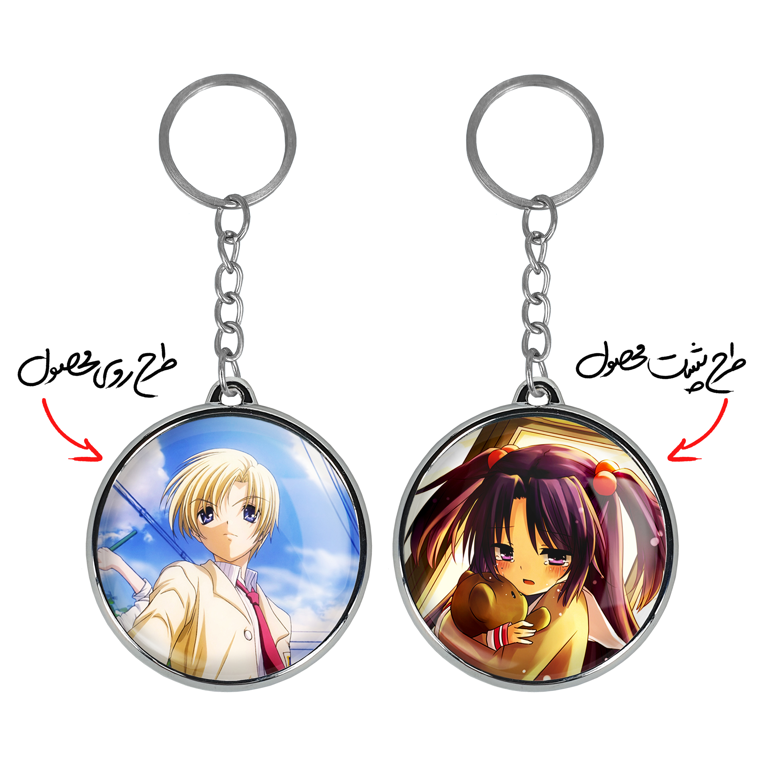 جاکلیدی دوطرفه یوهی انیمه کلاناد Clannad خندالو محصولی کاربردی و جدید است که در هر دو سمت محصول، تصویری متفاوت اما از یک موضوع چاپ شده و تفاوت اصلی آن با جاکلیدی های یک طرفه در همین است که هر دو سمت پشت و روی جاکلیدی، طرحی دیدنی و جذاب دارد. همچنین رینگ بکار برده شده برای دور طرح ها آبکاری کروم درجه یک و رنگ ثابت است و برخلاف سایر محصولات مشابه، از رنگ های متفرقه و یا سفید استفاده نشده، که این مهم، زیبایی محصول نهایی را چند برابر کرده است. جاکلیدی های دوطرفه یوهی انیمه کلاناد Clannad با استفاده از روکش سلفون براق ضدخش تولید شده که خاصیت ضدخش بودن آن عمر مفید استفاده از جاکلیدی ها را افزایش میدهد. چاپ جاکلیدی ها با دستگاه های استاندارد و با بهترین سطح کیفیت صورت گرفته و طرح با شفافیتی مثال زدنی و با سلفون چسبی تولید شده است که باعث شده محصول نهایی بدون شکست نور دیده شود. همچنین بسته بندی جذاب و مینیمال جاکلیدی دوطرفه یوهی انیمه کلاناد Clannad ، آنها را محصولی مناسب هدیه کرده است. زنجیر و حلقه بکار برده شده در جاکلیدی خندالو از نوع حلقه ضخیم و محکم بوده و حین استفاده آسیب نمی بیند.