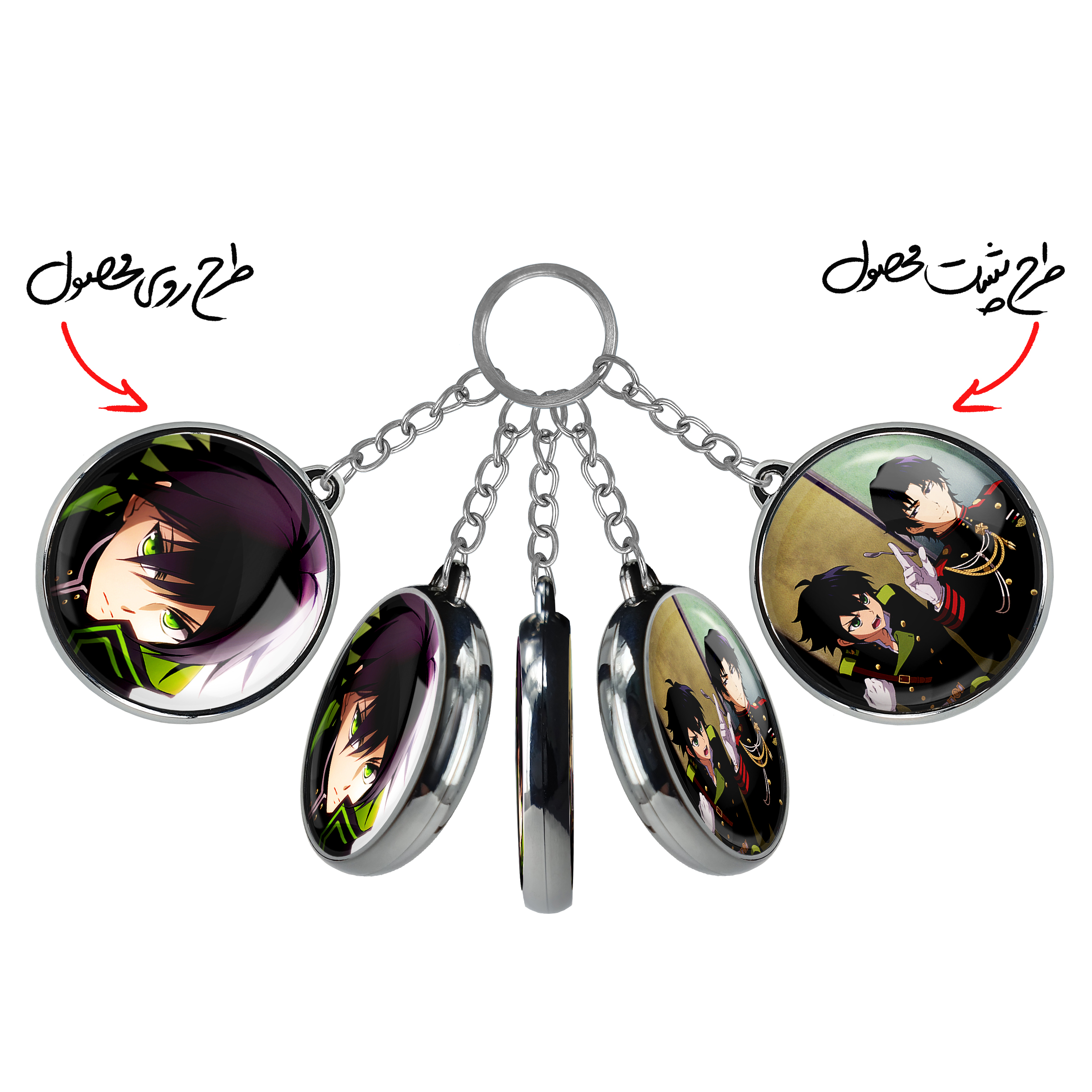 جاکلیدی دوطرفه یویچیرو هیاکویا انیمه اسرافیل پایانی خندالو محصولی کاربردی و جدید است که در هر دو سمت محصول، تصویری متفاوت اما از یک موضوع چاپ شده و تفاوت اصلی آن با جاکلیدی های یک طرفه در همین است که هر دو سمت پشت و روی جاکلیدی، طرحی دیدنی و جذاب دارد. همچنین رینگ بکار برده شده برای دور طرح ها آبکاری کروم درجه یک و رنگ ثابت است و برخلاف سایر محصولات مشابه، از رنگ های متفرقه و یا سفید استفاده نشده، که این مهم، زیبایی محصول نهایی را چند برابر کرده است. جاکلیدی های دوطرفه یویچیرو هیاکویا انیمه اسرافیل پایانی با استفاده از روکش سلفون براق ضدخش تولید شده که خاصیت ضدخش بودن آن عمر مفید استفاده از جاکلیدی ها را افزایش میدهد. چاپ جاکلیدی ها با دستگاه های استاندارد و با بهترین سطح کیفیت صورت گرفته و طرح با شفافیتی مثال زدنی و با سلفون چسبی تولید شده است که باعث شده محصول نهایی بدون شکست نور دیده شود. همچنین بسته بندی جذاب و مینیمال جاکلیدی دوطرفه یویچیرو هیاکویا انیمه اسرافیل پایانی ، آنها را محصولی مناسب هدیه کرده است. زنجیر و حلقه بکار برده شده در جاکلیدی خندالو از نوع حلقه ضخیم و محکم بوده و حین استفاده آسیب نمی بیند.