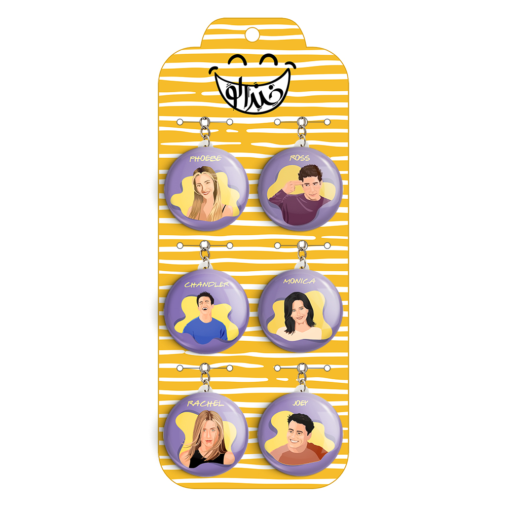 پک 6 عددی جاکلیدی خندالو طرح سریال فرندز(Friends) با استفاده از روکش سلفون حرارتی مات ضدخش تولید شده که خاصیت ضدخش بودن آن عمر مفید استفاده از جاکلیدی ها را افزایش میدهد. چاپ جاکلیدی ها با دستگاه های استاندارد و با بهترین سطح کیفیت صورت گرفته و طرح با شفافیتی مثال زدنی و با سلفون چسبی تولید شده است که باعث شده محصول نهایی بدون شکست نور دیده شود. همچنین بسته بندی جذاب و مینیمال جاکلیدی ها، آنها را محصولی مناسب هدیه کرده است. زنجیر و حلقه بکار برده شده در جاکلیدی خندالو از نوع حلقه درجه یک و ضخیم و محکم بوده و حین استفاده آسیب نمی بیند. قطعی پشتی جاکلیدی از جنس ABS شفاف سفید رنگ تولید شده که در مقابل خط و خش مقاوم بوده و به هیچ عنوان دچار شکستگی نخواهد شد.