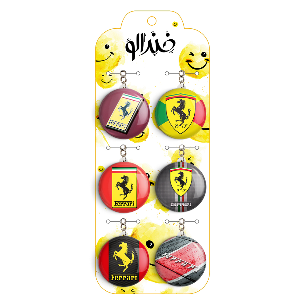 پک 6 عددی جاکلیدی خندالو طرح فراری (Ferrari) با استفاده از روکش سلفون حرارتی مات ضدخش تولید شده که خاصیت ضدخش بودن آن عمر مفید استفاده از جاکلیدی ها را افزایش میدهد. چاپ جاکلیدی ها با دستگاه های استاندارد و با بهترین سطح کیفیت صورت گرفته و طرح با شفافیتی مثال زدنی و با سلفون چسبی تولید شده است که باعث شده محصول نهایی بدون شکست نور دیده شود. همچنین بسته بندی جذاب و مینیمال جاکلیدی ها، آنها را محصولی مناسب هدیه کرده است. زنجیر و حلقه بکار برده شده در جاکلیدی خندالو از نوع حلقه درجه یک و ضخیم و محکم بوده و حین استفاده آسیب نمی بیند. قطعی پشتی جاکلیدی از جنس ABS شفاف سفید رنگ تولید شده که در مقابل خط و خش مقاوم بوده و به هیچ عنوان دچار شکستگی نخواهد شد.