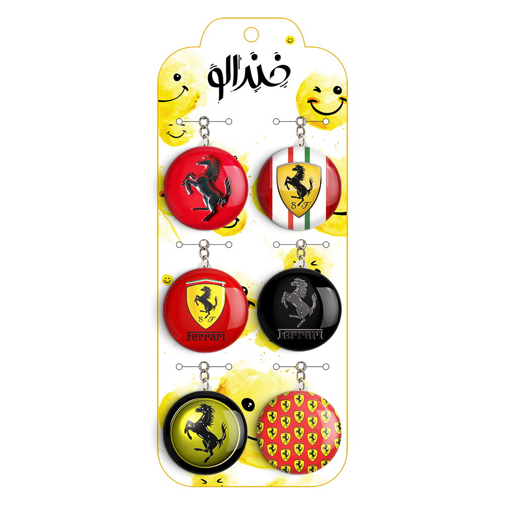 پک 6 عددی جاکلیدی خندالو طرح فراری (Ferrari) با استفاده از روکش سلفون حرارتی مات ضدخش تولید شده که خاصیت ضدخش بودن آن عمر مفید استفاده از جاکلیدی ها را افزایش میدهد. چاپ جاکلیدی ها با دستگاه های استاندارد و با بهترین سطح کیفیت صورت گرفته و طرح با شفافیتی مثال زدنی و با سلفون چسبی تولید شده است که باعث شده محصول نهایی بدون شکست نور دیده شود. همچنین بسته بندی جذاب و مینیمال جاکلیدی ها، آنها را محصولی مناسب هدیه کرده است. زنجیر و حلقه بکار برده شده در جاکلیدی خندالو از نوع حلقه درجه یک و ضخیم و محکم بوده و حین استفاده آسیب نمی بیند. قطعی پشتی جاکلیدی از جنس ABS شفاف سفید رنگ تولید شده که در مقابل خط و خش مقاوم بوده و به هیچ عنوان دچار شکستگی نخواهد شد.