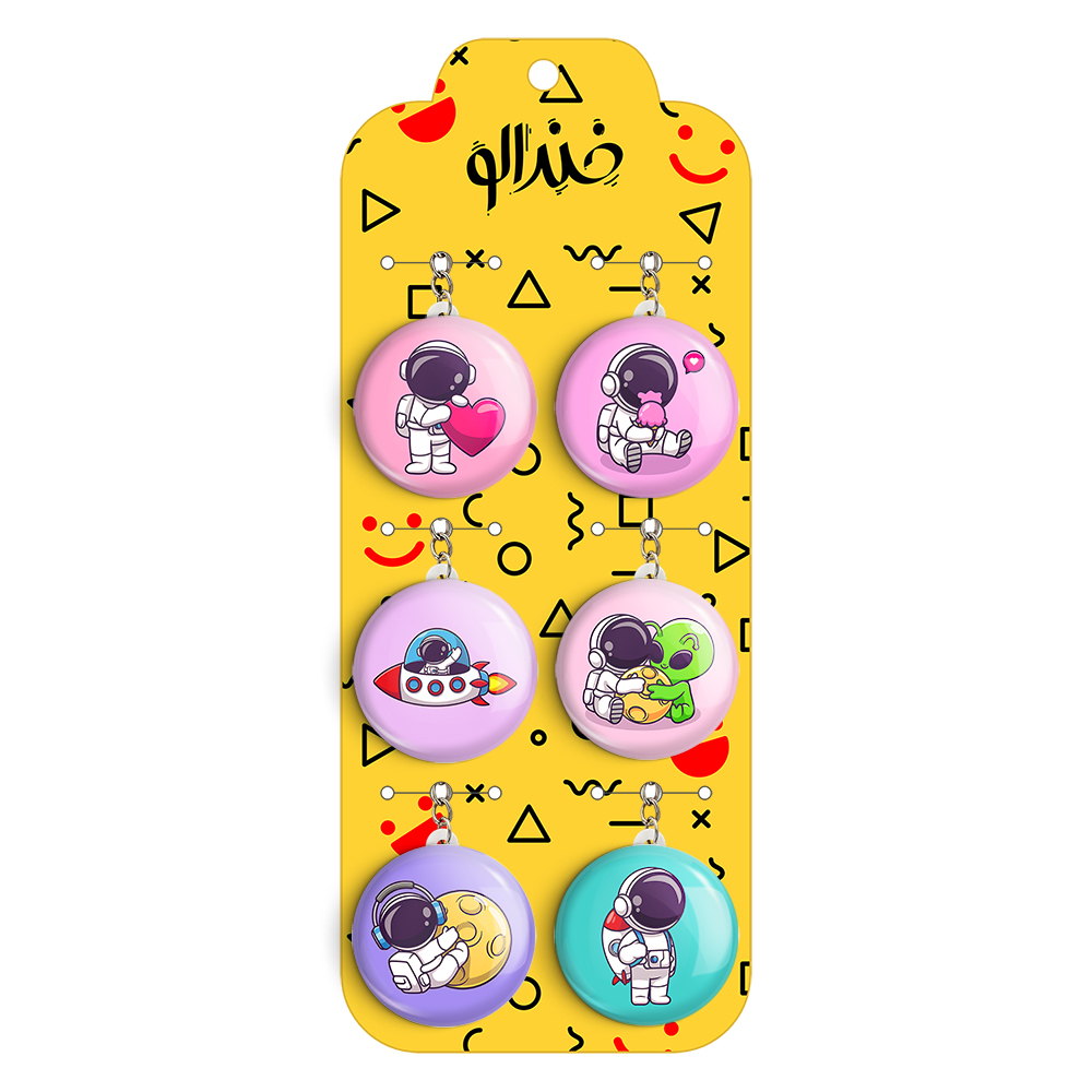 پک 6 عددی جاکلیدی خندالو طرح فضانورد (astronaut) با استفاده از روکش سلفون حرارتی مات ضدخش تولید شده که خاصیت ضدخش بودن آن عمر مفید استفاده از جاکلیدی ها را افزایش میدهد. چاپ جاکلیدی ها با دستگاه های استاندارد و با بهترین سطح کیفیت صورت گرفته و طرح با شفافیتی مثال زدنی و با سلفون چسبی تولید شده است که باعث شده محصول نهایی بدون شکست نور دیده شود.