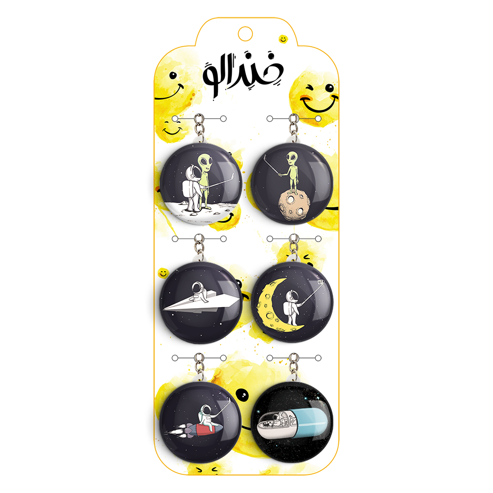پک 6 عددی جاکلیدی خندالو طرح فضایی (Spatial) با استفاده از روکش سلفون حرارتی مات ضدخش تولید شده که خاصیت ضدخش بودن آن عمر مفید استفاده از جاکلیدی ها را افزایش میدهد. چاپ جاکلیدی ها با دستگاه های استاندارد و با بهترین سطح کیفیت صورت گرفته و طرح با شفافیتی مثال زدنی و با سلفون چسبی تولید شده است که باعث شده محصول نهایی بدون شکست نور دیده شود.