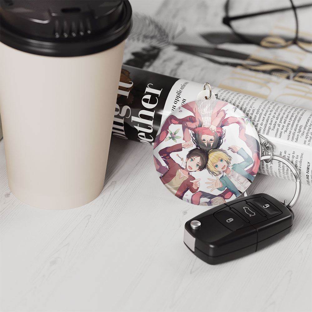 خندالو جاکلیدی میکاسا و ارن و ارمین انیمه اتک آن تایتان Attack on Titan را با استفاده از روکش سلفون حرارتی مات مخملی ضدخش تولید می کند که خاصیت ضدخش بودن آن، کمک میکند تا عمر مفید استفاده از جاکلیدی ها افزایش پیدا کند و با یک خراش ساده مثل برخورد سطح ناخن با محصول، دچار و خط و خش نشود.