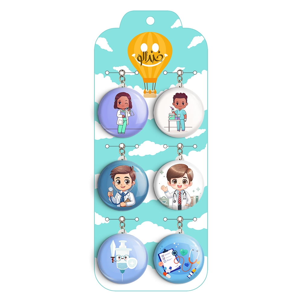 پک 6 عددی جاکلیدی خندالو طرح پزشک و پرستار کودکانه با استفاده از روکش سلفون حرارتی مات ضدخش تولید شده که خاصیت ضدخش بودن آن عمر مفید استفاده از جاکلیدی ها را افزایش میدهد. چاپ جاکلیدی ها با دستگاه های استاندارد و با بهترین سطح کیفیت صورت گرفته و طرح با شفافیتی مثال زدنی و با سلفون چسبی تولید شده است که باعث شده محصول نهایی بدون شکست نور دیده شود. همچنین بسته بندی جذاب و مینیمال جاکلیدی ها، آنها را محصولی مناسب هدیه کرده است. زنجیر و حلقه بکار برده شده در جاکلیدی خندالو از نوع حلقه درجه یک و ضخیم و محکم بوده و حین استفاده آسیب نمی بیند. قطعی پشتی جاکلیدی از جنس ABS شفاف سفید رنگ تولید شده که در مقابل خط و خش مقاوم بوده و به هیچ عنوان دچار شکستگی نخواهد شد.