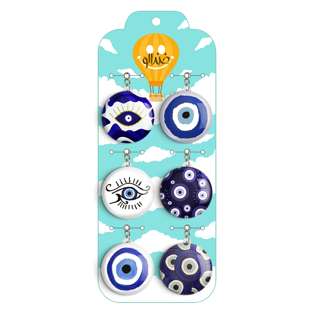 پک 6 عددی جاکلیدی خندالو طرح چشم نظر با استفاده از روکش سلفون حرارتی مات ضدخش تولید شده که خاصیت ضدخش بودن آن عمر مفید استفاده از جاکلیدی ها را افزایش میدهد. چاپ جاکلیدی ها با دستگاه های استاندارد و با بهترین سطح کیفیت صورت گرفته و طرح با شفافیتی مثال زدنی و با سلفون چسبی تولید شده است که باعث شده محصول نهایی بدون شکست نور دیده شود. همچنین بسته بندی جذاب و مینیمال جاکلیدی ها، آنها را محصولی مناسب هدیه کرده است. زنجیر و حلقه بکار برده شده در جاکلیدی خندالو از نوع حلقه درجه یک و ضخیم و محکم بوده و حین استفاده آسیب نمی بیند. قطعی پشتی جاکلیدی از جنس ABS شفاف سفید رنگ تولید شده که در مقابل خط و خش مقاوم بوده و به هیچ عنوان دچار شکستگی نخواهد شد.