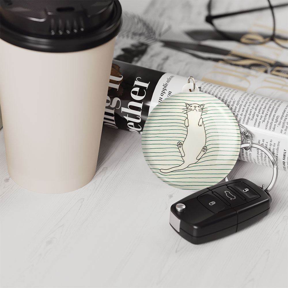خندالو جاکلیدی گربه را با استفاده از روکش سلفون حرارتی مات مخملی ضدخش تولید می کند که خاصیت ضدخش بودن آن، کمک میکند تا عمر مفید استفاده از جاکلیدی ها افزایش پیدا کند و با یک خراش ساده مثل برخورد سطح ناخن با محصول، دچار و خط و خش نشود.