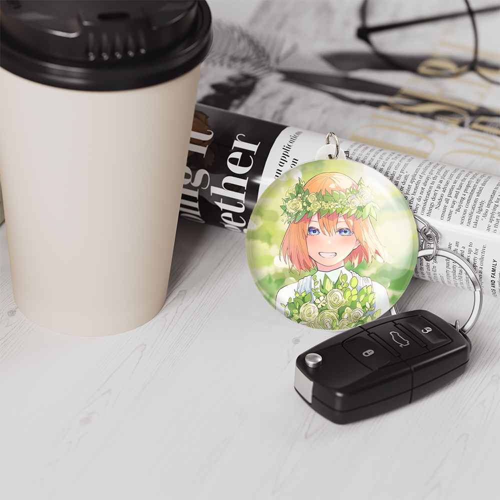 خندالو جاکلیدی یوتسوبا انیمه پنج عروس مساوی را با استفاده از روکش سلفون حرارتی مات مخملی ضدخش تولید می کند که خاصیت ضدخش بودن آن، کمک میکند تا عمر مفید استفاده از جاکلیدی ها افزایش پیدا کند و با یک خراش ساده مثل برخورد سطح ناخن با محصول، دچار و خط و خش نشود.