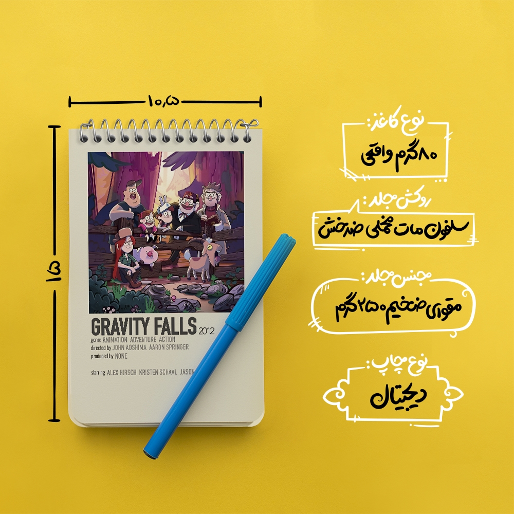 برند خندالو در زمینه تولید انواع دفاتر فانتزی و تحصیلی فعالیت میکند که به دلیل جذابیت ظاهری و طرح های متنوع طرفداران زیادی دارد. دفتر یادداشت خندالو طرح آبشار جاذبه (Gravity Falls) محصولی مناسب برای همه عاشقان لوازم التحریر است و همچنین همه کسانی که بنا به موقعیت تحصیل یا شغلشان با دفتر و نوشت افزار زیاد سر و کار دارند. در تولید دفتر یادداشت خندالو طرح آبشار جاذبه (Gravity Falls) از نوع صحافی فنر مارپیچ استفاده شده که در این نوع صحافی برگه‌ها به راحتی چرخیده و یا بیرون آورده می شوند.