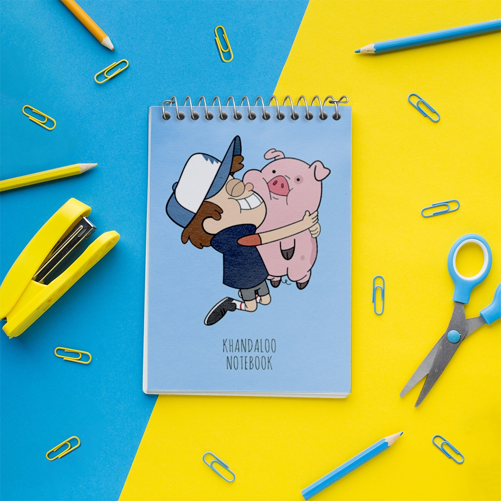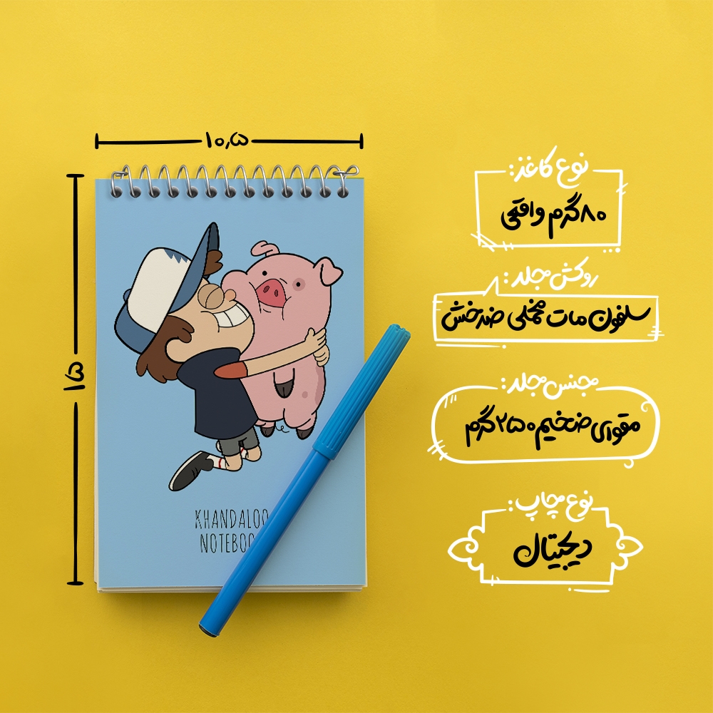 برند خندالو در زمینه تولید انواع دفاتر فانتزی و تحصیلی فعالیت میکند که به دلیل جذابیت ظاهری و طرح های متنوع طرفداران زیادی دارد. دفتر یادداشت خندالو طرح آبشار جاذبه (Gravity Falls) محصولی مناسب برای همه عاشقان لوازم التحریر است و همچنین همه کسانی که بنا به موقعیت تحصیل یا شغلشان با دفتر و نوشت افزار زیاد سر و کار دارند. در تولید دفتر یادداشت خندالو طرح آبشار جاذبه (Gravity Falls) از نوع صحافی فنر مارپیچ استفاده شده که در این نوع صحافی برگه‌ها به راحتی چرخیده و یا بیرون آورده می شوند.