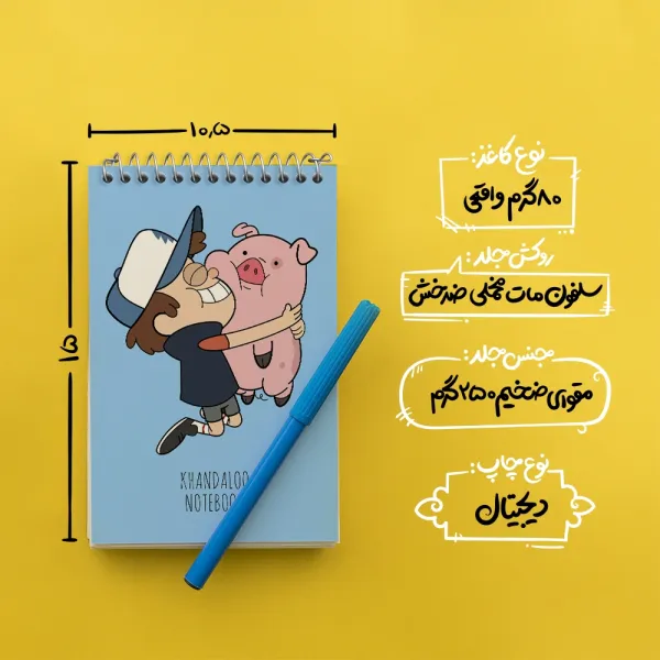 برند خندالو در زمینه تولید انواع دفاتر فانتزی و تحصیلی فعالیت میکند که به دلیل جذابیت ظاهری و طرح های متنوع طرفداران زیادی دارد. دفتر یادداشت خندالو طرح آبشار جاذبه (Gravity Falls) محصولی مناسب برای همه عاشقان لوازم التحریر است و همچنین همه کسانی که بنا به موقعیت تحصیل یا شغلشان با دفتر و نوشت افزار زیاد سر و کار دارند. در تولید دفتر یادداشت خندالو طرح آبشار جاذبه (Gravity Falls) از نوع صحافی فنر مارپیچ استفاده شده که در این نوع صحافی برگه‌ها به راحتی چرخیده و یا بیرون آورده می شوند.