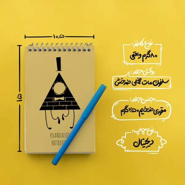 برند خندالو در زمینه تولید انواع دفاتر فانتزی و تحصیلی فعالیت میکند که به دلیل جذابیت ظاهری و طرح های متنوع طرفداران زیادی دارد. دفتر یادداشت خندالو طرح آبشار جاذبه (Gravity Falls) محصولی مناسب برای همه عاشقان لوازم التحریر است و همچنین همه کسانی که بنا به موقعیت تحصیل یا شغلشان با دفتر و نوشت افزار زیاد سر و کار دارند. در تولید دفتر یادداشت خندالو طرح آبشار جاذبه (Gravity Falls) از نوع صحافی فنر مارپیچ استفاده شده که در این نوع صحافی برگه‌ها به راحتی چرخیده و یا بیرون آورده می شوند.
