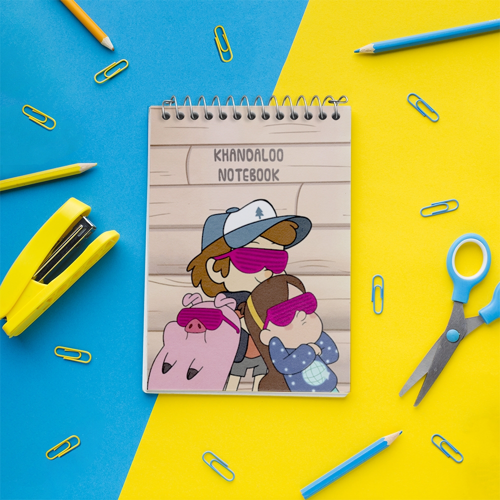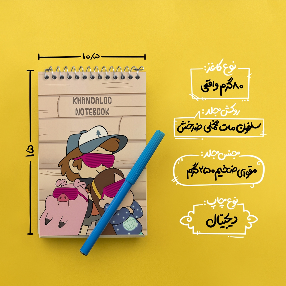 برند خندالو در زمینه تولید انواع دفاتر فانتزی و تحصیلی فعالیت میکند که به دلیل جذابیت ظاهری و طرح های متنوع طرفداران زیادی دارد. دفتر یادداشت خندالو طرح آبشار جاذبه (Gravity Falls) محصولی مناسب برای همه عاشقان لوازم التحریر است و همچنین همه کسانی که بنا به موقعیت تحصیل یا شغلشان با دفتر و نوشت افزار زیاد سر و کار دارند. در تولید دفتر یادداشت خندالو طرح آبشار جاذبه (Gravity Falls) از نوع صحافی فنر مارپیچ استفاده شده که در این نوع صحافی برگه‌ها به راحتی چرخیده و یا بیرون آورده می شوند.