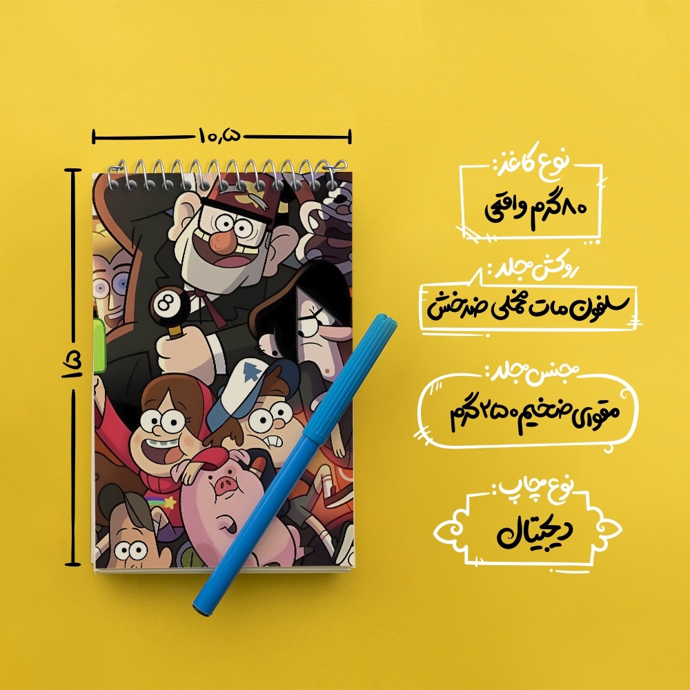 برند خندالو در زمینه تولید انواع دفاتر فانتزی و تحصیلی فعالیت میکند که به دلیل جذابیت ظاهری و طرح های متنوع طرفداران زیادی دارد. دفتر یادداشت خندالو طرح آبشار جاذبه (Gravity Falls) محصولی مناسب برای همه عاشقان لوازم التحریر است و همچنین همه کسانی که بنا به موقعیت تحصیل یا شغلشان با دفتر و نوشت افزار زیاد سر و کار دارند. در تولید دفتر یادداشت خندالو طرح آبشار جاذبه (Gravity Falls) از نوع صحافی فنر مارپیچ استفاده شده که در این نوع صحافی برگه‌ها به راحتی چرخیده و یا بیرون آورده می شوند.