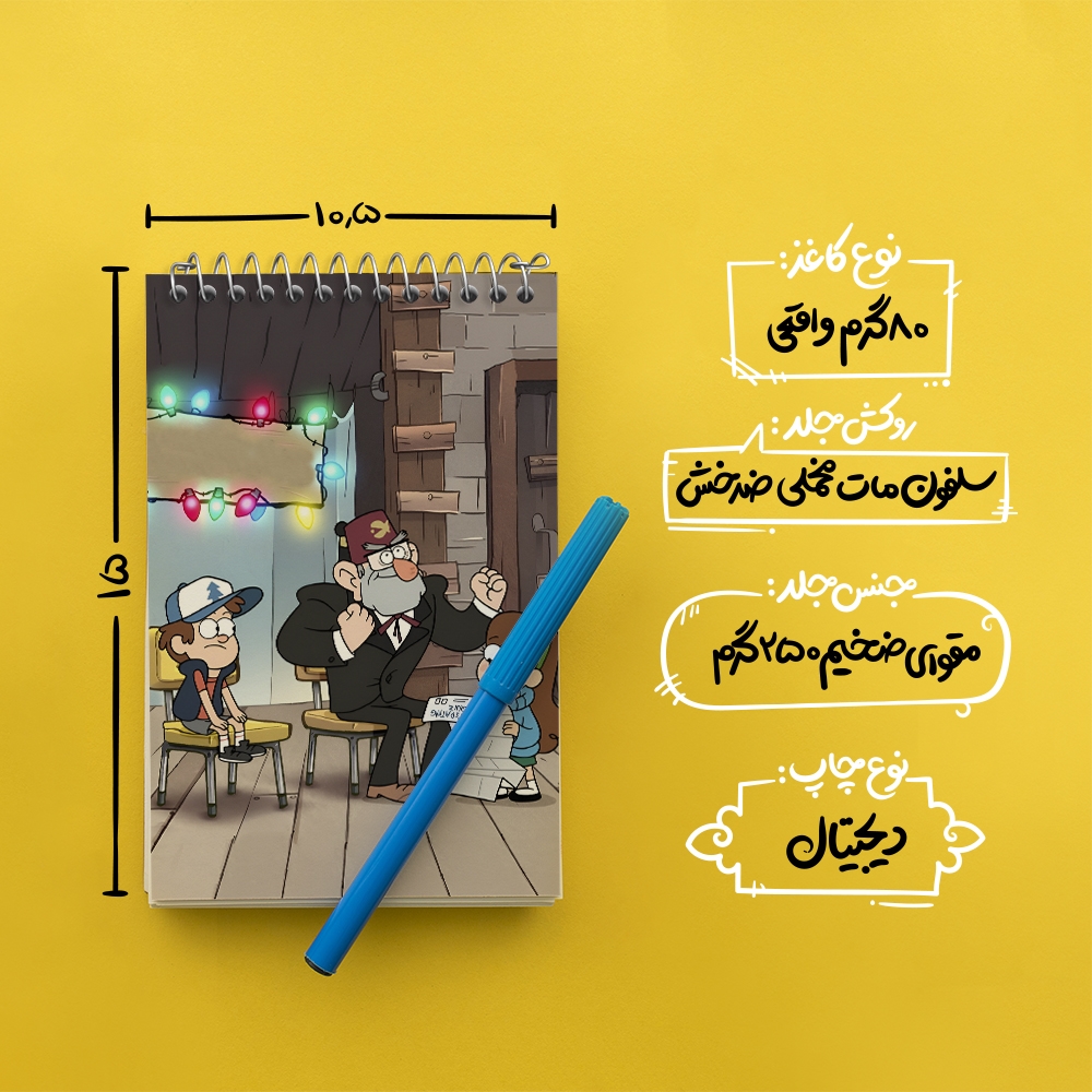 برند خندالو در زمینه تولید انواع دفاتر فانتزی و تحصیلی فعالیت میکند که به دلیل جذابیت ظاهری و طرح های متنوع طرفداران زیادی دارد. دفتر یادداشت خندالو طرح آبشار جاذبه (Gravity Falls) محصولی مناسب برای همه عاشقان لوازم التحریر است و همچنین همه کسانی که بنا به موقعیت تحصیل یا شغلشان با دفتر و نوشت افزار زیاد سر و کار دارند. در تولید دفتر یادداشت خندالو طرح آبشار جاذبه (Gravity Falls) از نوع صحافی فنر مارپیچ استفاده شده که در این نوع صحافی برگه‌ها به راحتی چرخیده و یا بیرون آورده می شوند.