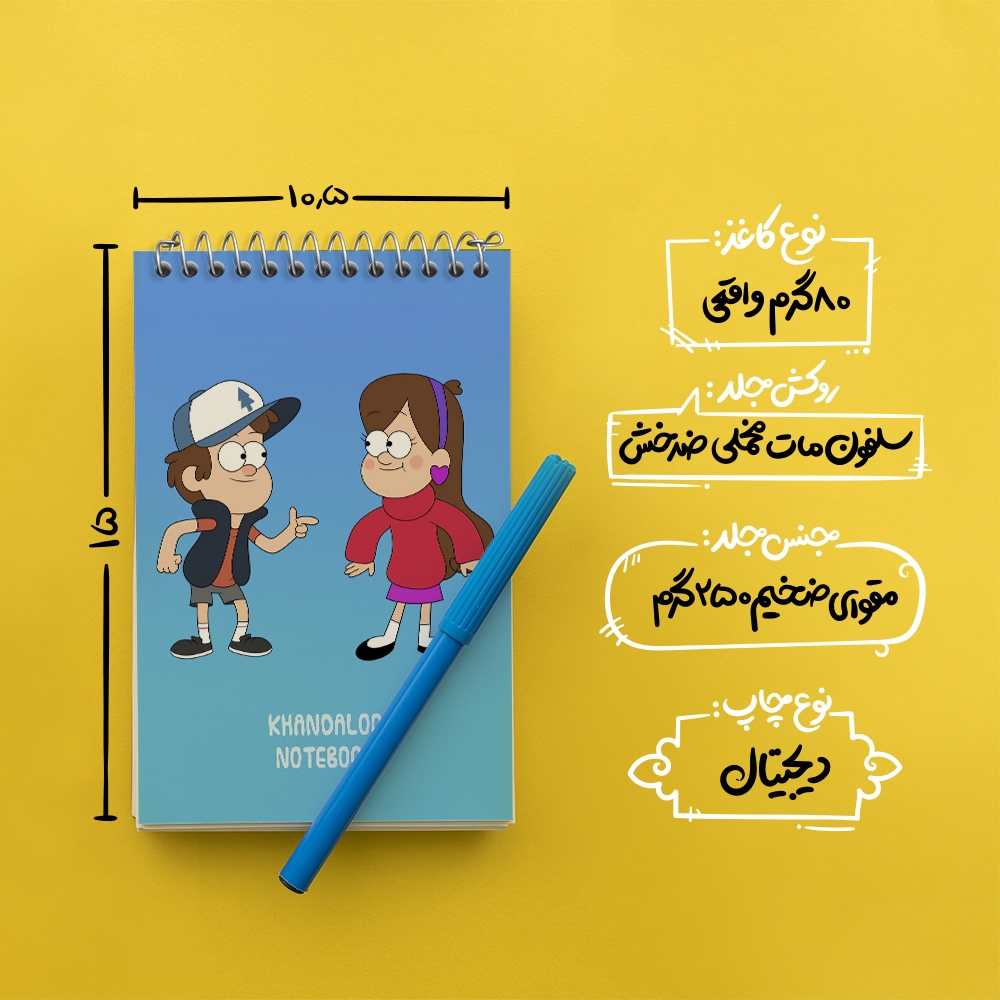 برند خندالو در زمینه تولید انواع دفاتر فانتزی و تحصیلی فعالیت میکند که به دلیل جذابیت ظاهری و طرح های متنوع طرفداران زیادی دارد. دفتر یادداشت خندالو طرح آبشار جاذبه (Gravity Falls) محصولی مناسب برای همه عاشقان لوازم التحریر است و همچنین همه کسانی که بنا به موقعیت تحصیل یا شغلشان با دفتر و نوشت افزار زیاد سر و کار دارند. در تولید دفتر یادداشت خندالو طرح آبشار جاذبه (Gravity Falls) از نوع صحافی فنر مارپیچ استفاده شده که در این نوع صحافی برگهها به راحتی چرخیده و یا بیرون آورده می شوند. دفتر های خندالو دارای جلد انعطاف پذیر از جنس مقوای گلاسه 250 گرم با روکش سلفون مات مخملی است که به شما امکان میدهد از دفتر خود بدون اینکه نگرانی از شکستن یا خراب شدن جلد را داشته باشید استفاده کنید و همچنین در این دفاتر از کاغذ 80 گرم با کیفیت استفاده شده که باعث میشود هنگام نوشتن به خوبی جوهر قلم بر روی صفحه نشسته و از خط خوردگیها جلوگیری کند. دفتر یادداشت خندالو با جنس و دوام مناسب، برگه های کاملاً سفید و خطوط طوسی دقیق را داراست که انسان را به نوشتن منظم و زیبا ترغیب میکند. طراحی کاملاً مناسب این دفاتر، به همراه کیفیت بالا، از آن یک محصول مورد علاقه و قابل اعتماد برای همه مقاطع تحصیلی میسازد. دفتر یادداشت خندالو طرح آبشار جاذبه (Gravity Falls) انتخابی هوشمندانه و مناسب برای افرادی است که به دنبال دفتری با کیفیت و کاربرد عالی هستند. این دفتر، همراه خوبی برای شما در تمام مراحل تحصیل و کار خواهد بود و تجربهای لذتبخش از نوشتن و آموختن را به شما هدیه میدهد.