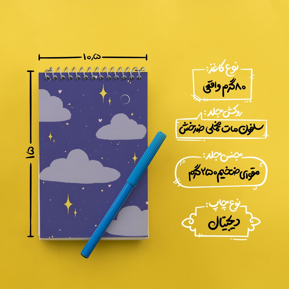 برند خندالو در زمینه تولید انواع دفاتر فانتزی و تحصیلی فعالیت میکند که به دلیل جذابیت ظاهری و طرح های متنوع طرفداران زیادی دارد. دفتر یادداشت خندالو طرح آسمان شب محصولی مناسب برای همه عاشقان لوازم التحریر است و همچنین همه کسانی که بنا به موقعیت تحصیل یا شغلشان با دفتر و نوشت افزار زیاد سر و کار دارند. در تولید دفتر یادداشت خندالو طرح آسمان شب از نوع صحافی فنر مارپیچ استفاده شده که در این نوع صحافی برگه‌ها به راحتی چرخیده و یا بیرون آورده می شوند.